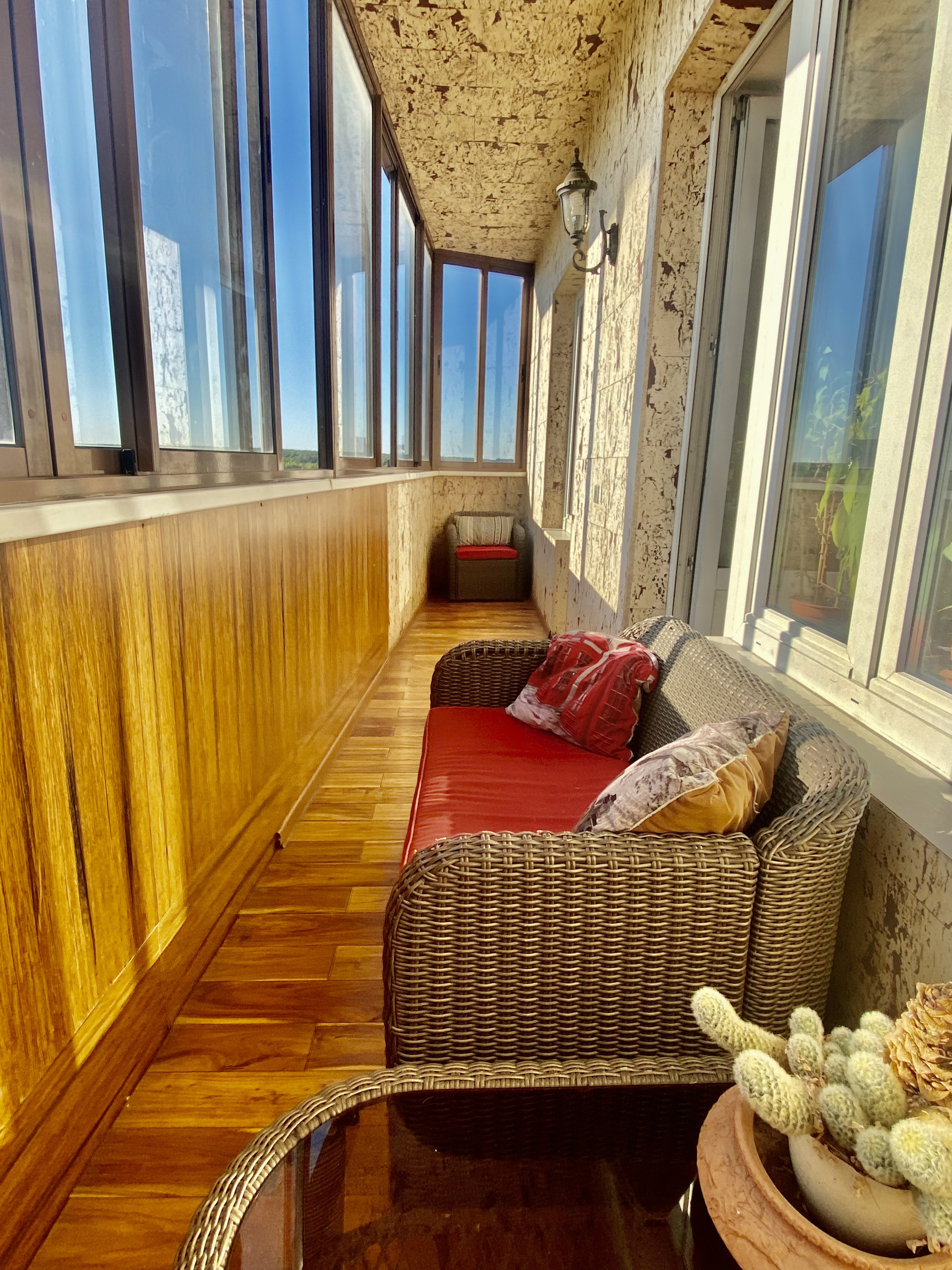 - 4 просторные остеклённые лоджии с панорамными видами на парк, а также ухоженный внутренний двор и на улицу. Одна из лоджий отделана стеновыми панелями из пробки и паркетом из массива