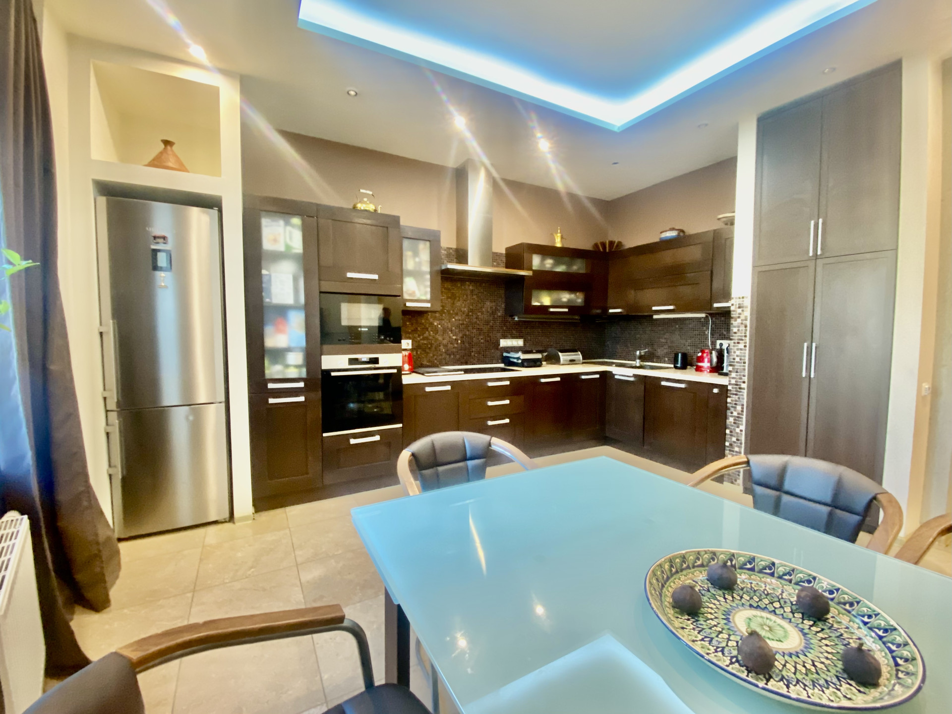 - Встроенный электрический гриль с вулканическими камнями на кухне. В спальне - оборудованная гардеробная комната 4 м2. Качественная встроенная мебель.