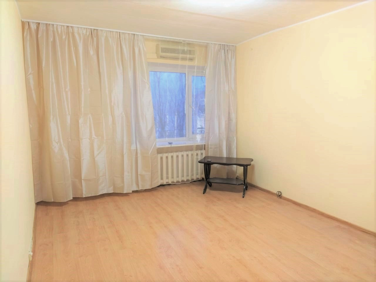 в гостиной диван, журнальный столик и кондиционер.
