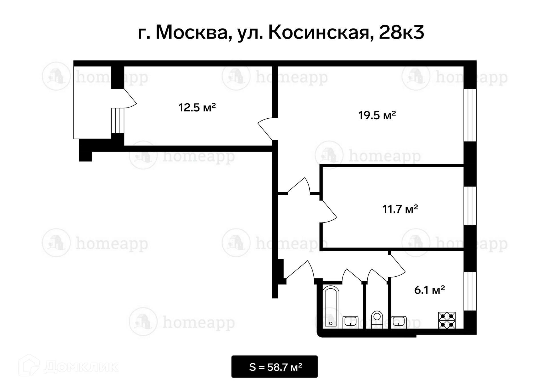 Общая площадь 58.7 м2