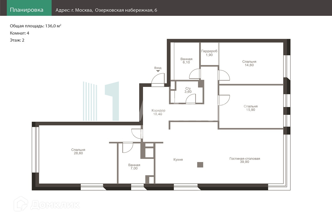 4-комнатная квартира, 136 м2, этаж 2 / 22, на продажу в Москве, Большая Татарская улица, вл13с16