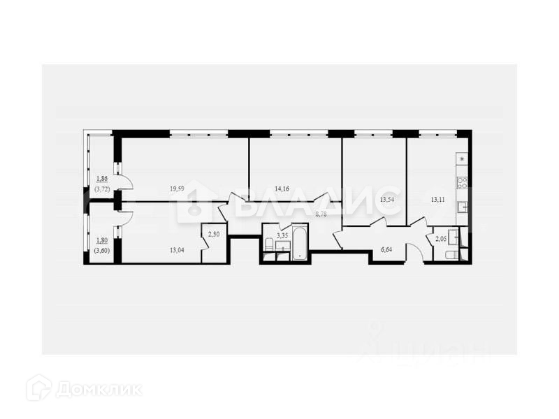 4 Спальные 13,04+19,59+14,16+13,54 кв.м.