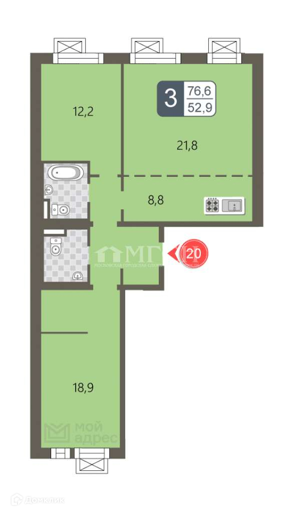 Жилая площадь 52.9 м2