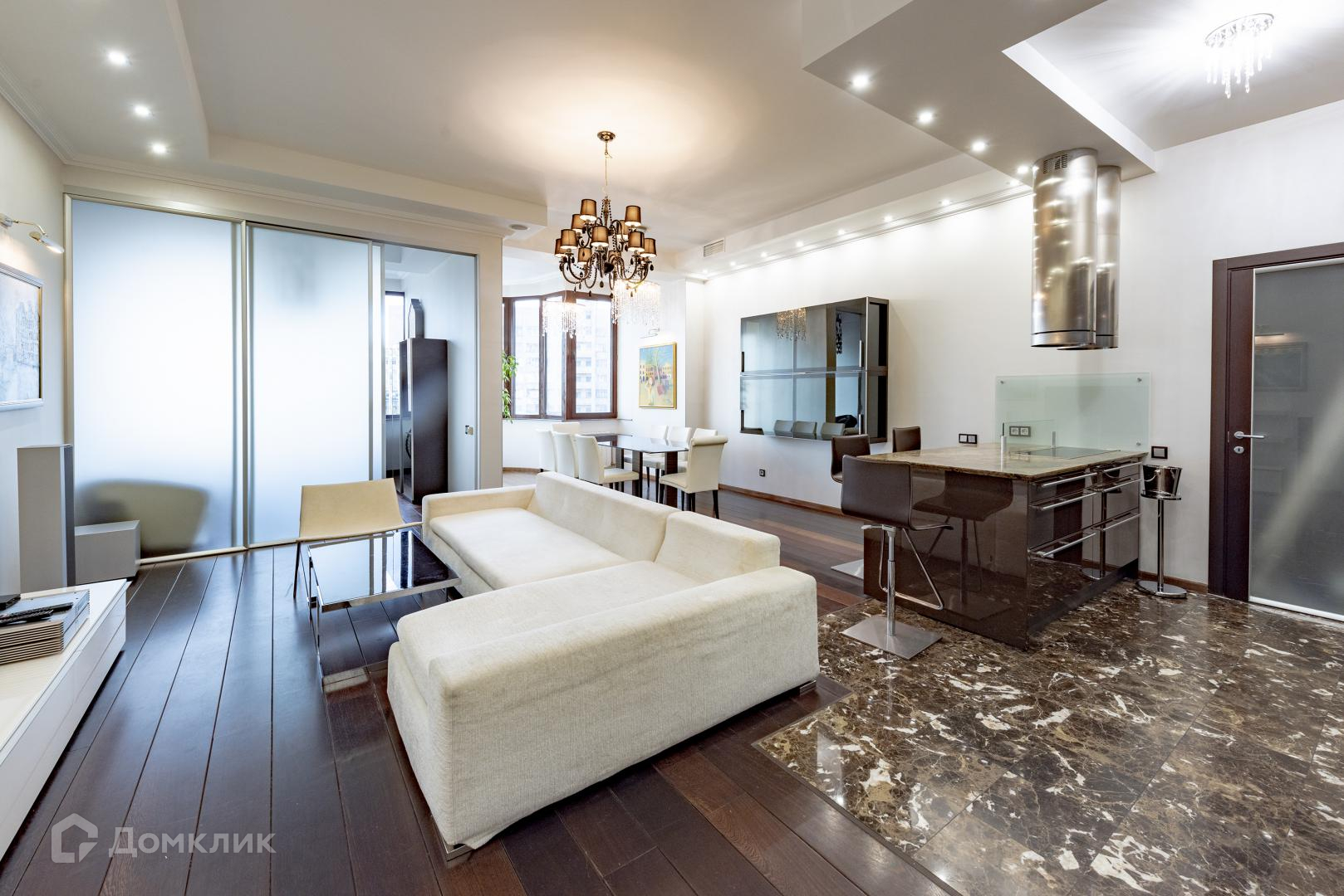 Прихожая, 3 темных комнаты, Две из них гардеробные и одна в кухне — подсобное помещение. Кухня-гостинная 40 метров, три изолированные спальни; кабинет, три сан узла. Выполнен дорогостоящий ремонт из высококачественных материалов. Делался для себя.