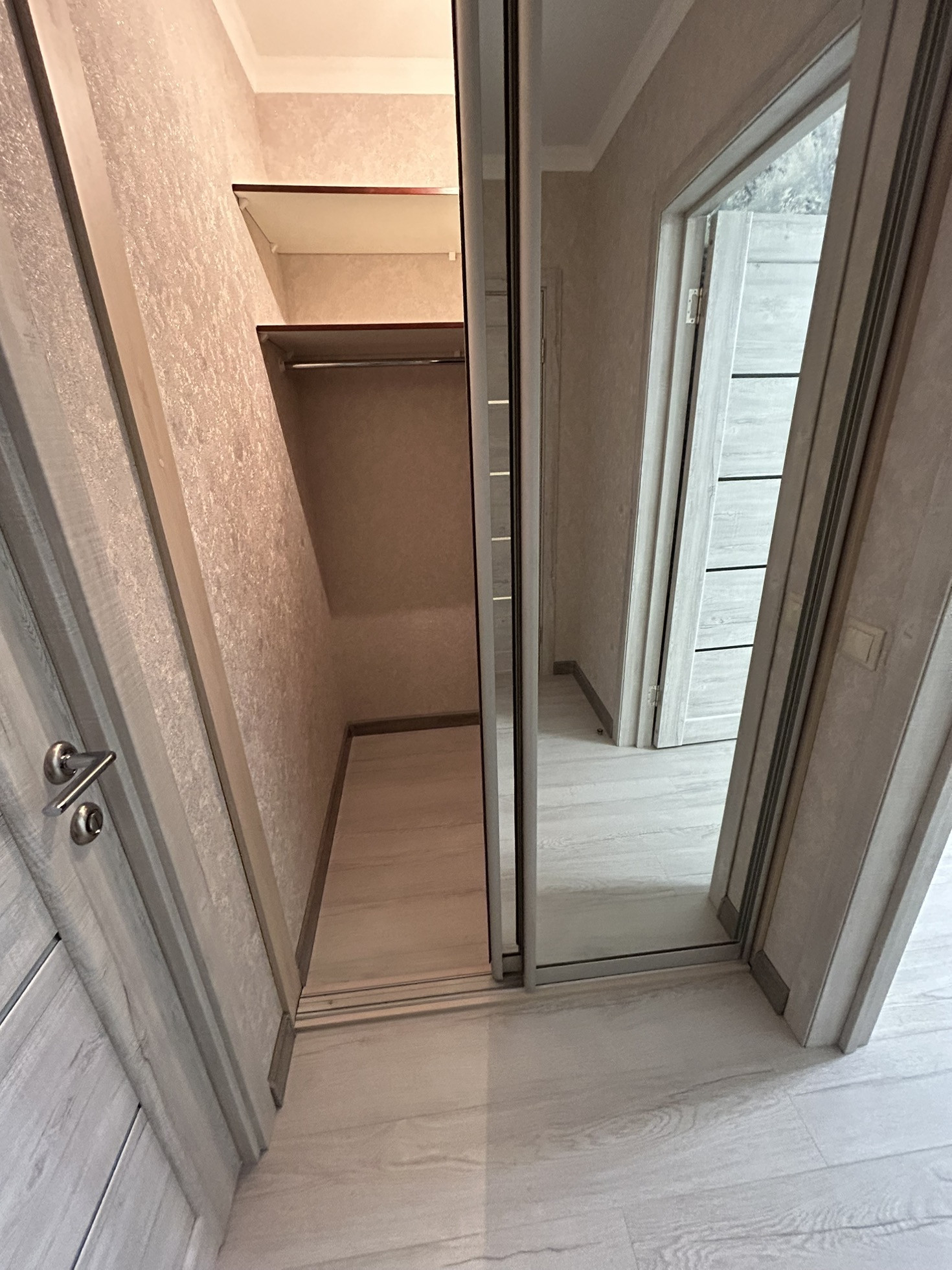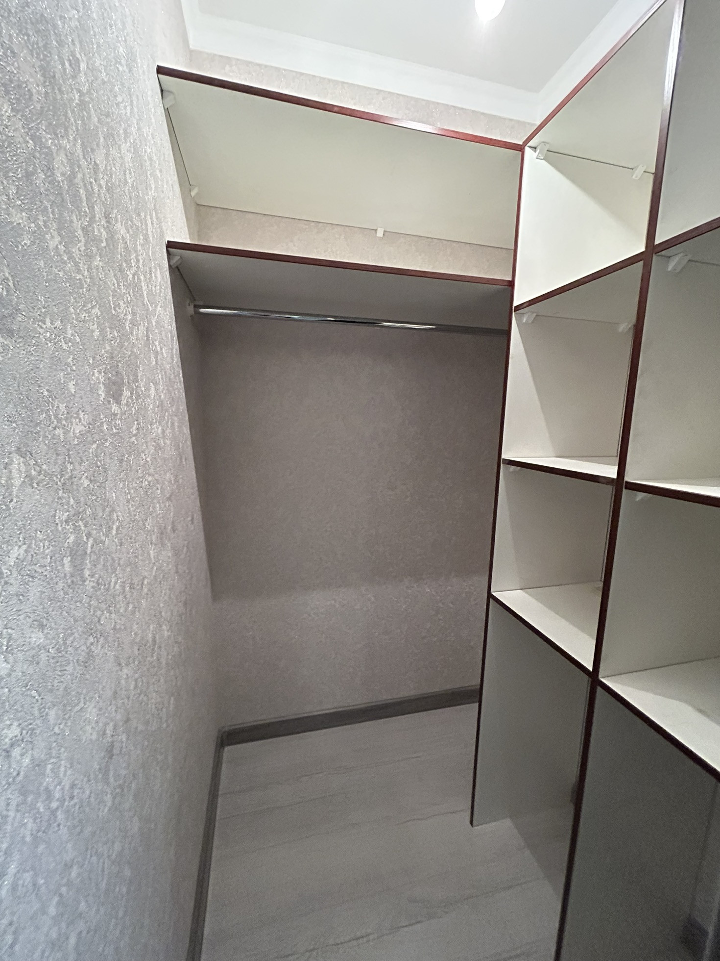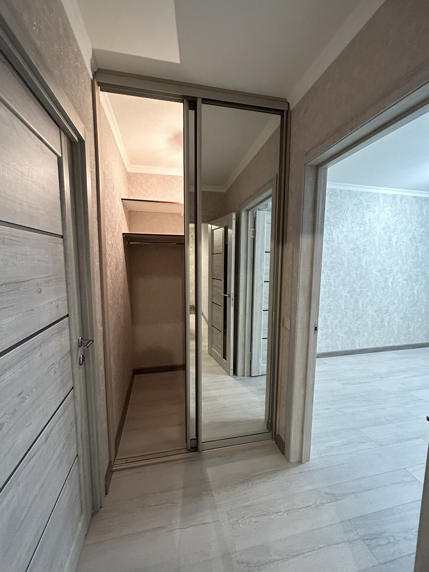 Функциональная планировка распашонка, общая площадь 59.2 кв. м., три комнаты, гардеробная комната, совмещенный санузел с большой угловой ванной, лоджия остеклена.