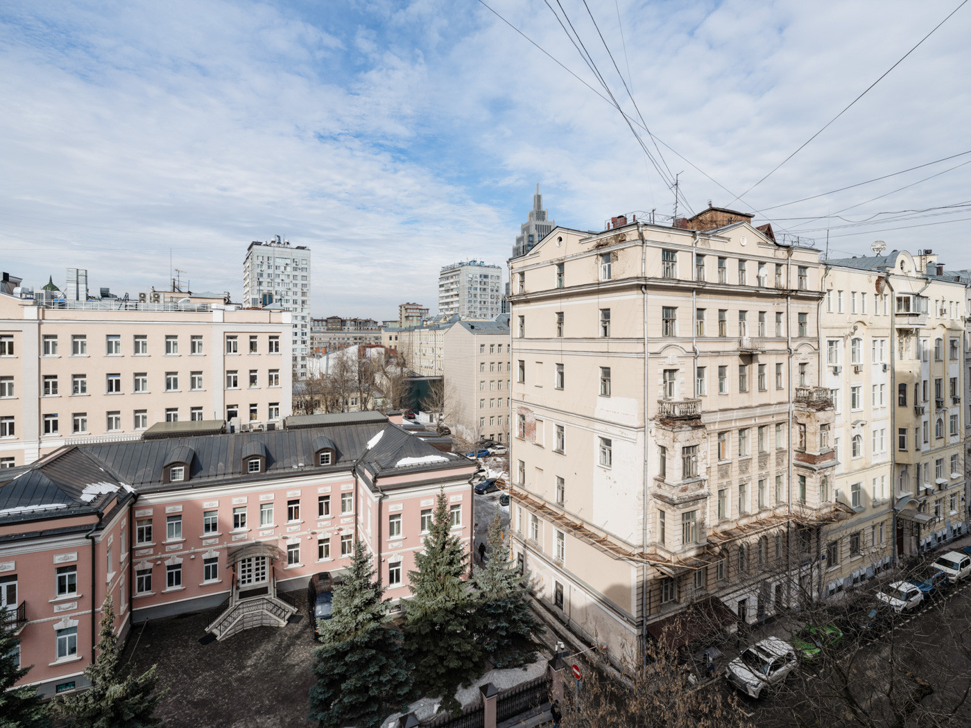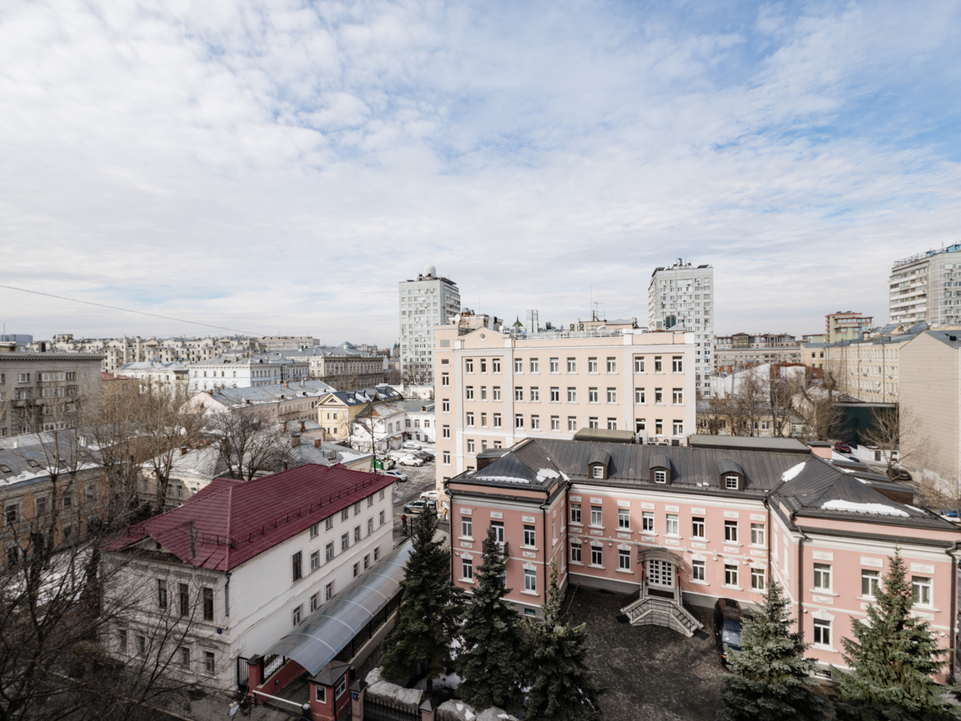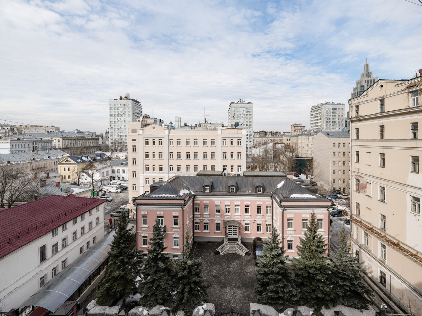 ВИД из окна на Старопименовский переулок (северо-запад) и переулки Старой Москвы, напротив - приятный двухэтажный особняк с ёлками .