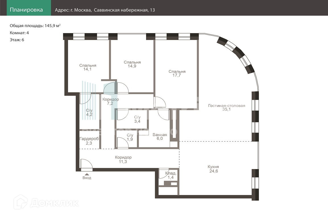 4-комнатная квартира, 147 м2, этаж 6 / 22, на продажу в Москве, Саввинская набережная, 13