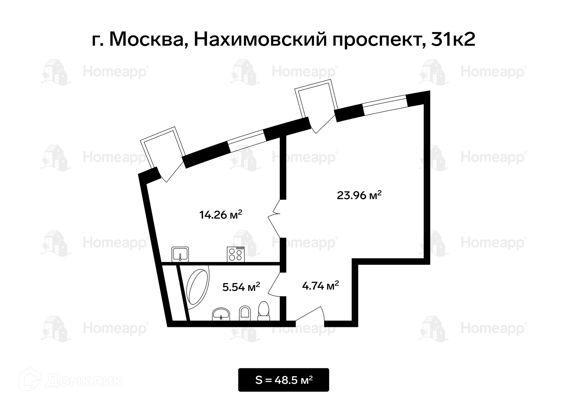 2-комнатная квартира, 48.5 м2, этаж 6 / 23, на продажу в Москве, Нахимовский проспект, 31к2