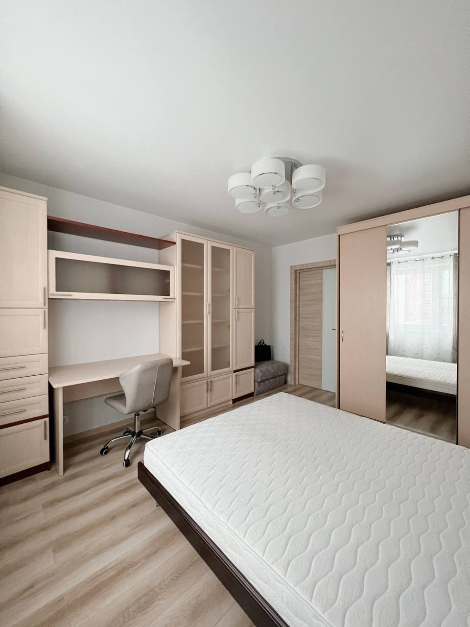 Комната, площадью 14,5 м2 оснащена двуспальной кроватью, стенкой с рабочей зоной, платяным шкафом-купе.