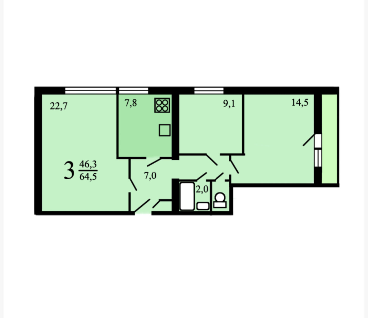 Общая площадь 65 кв. м., + 6 кв.м., лоджия. Комнаты изолированные: 23 м2, 9 м2 и 15 м2. , кухня 8 кв. м., с/у раздельный.