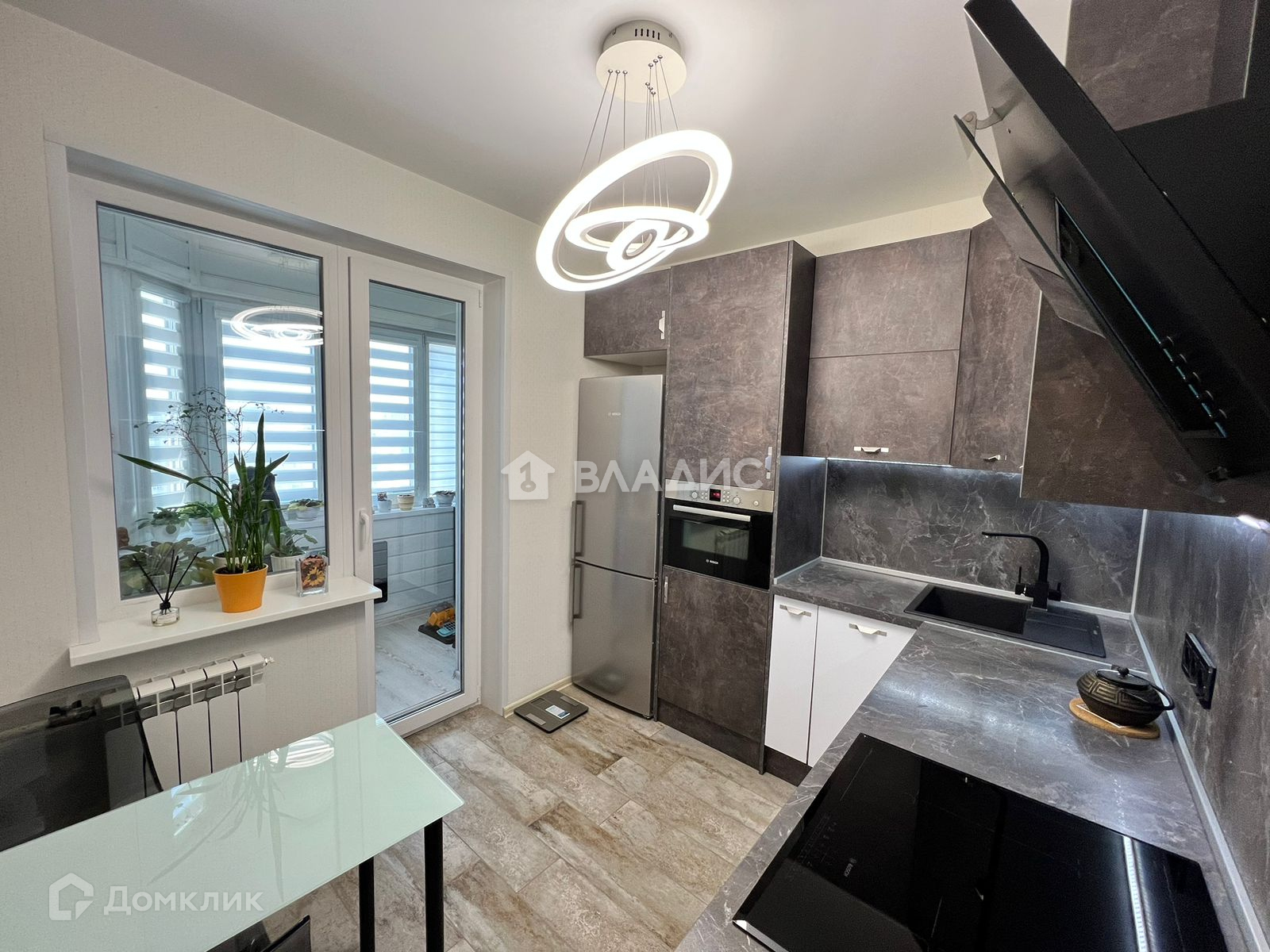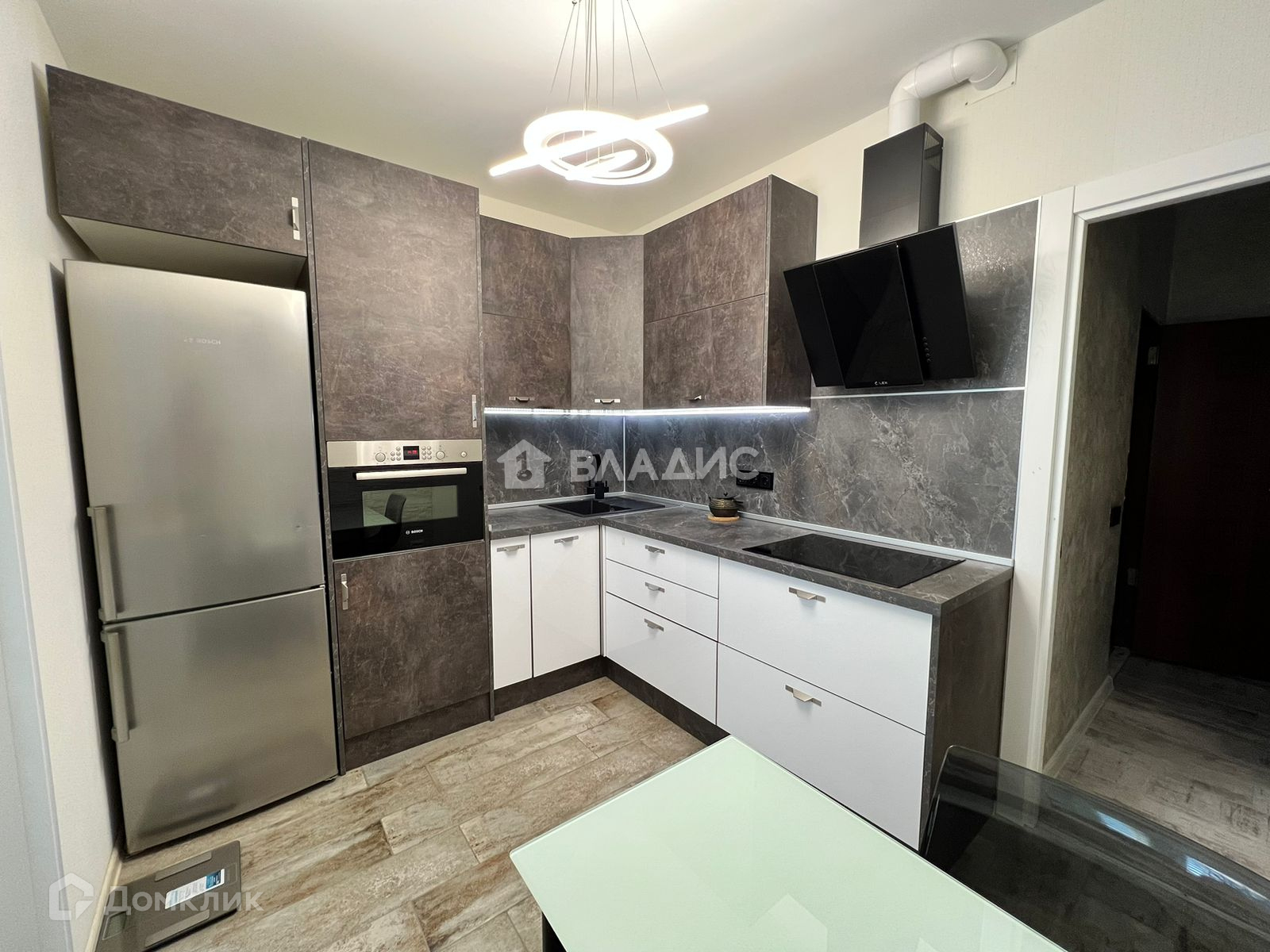 Кухня - дизайнерский современный гарнитур с холодильником, духовка+СВЧ, варочная поверхность, вытяжка. Пол-плитка, потолок натяжной.