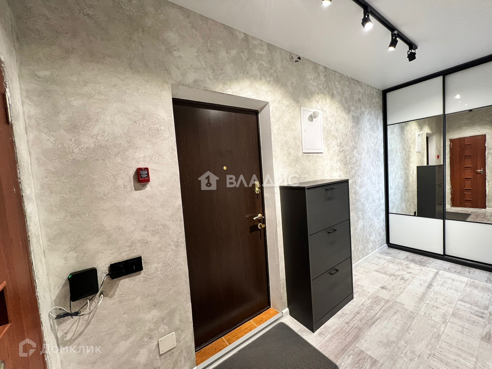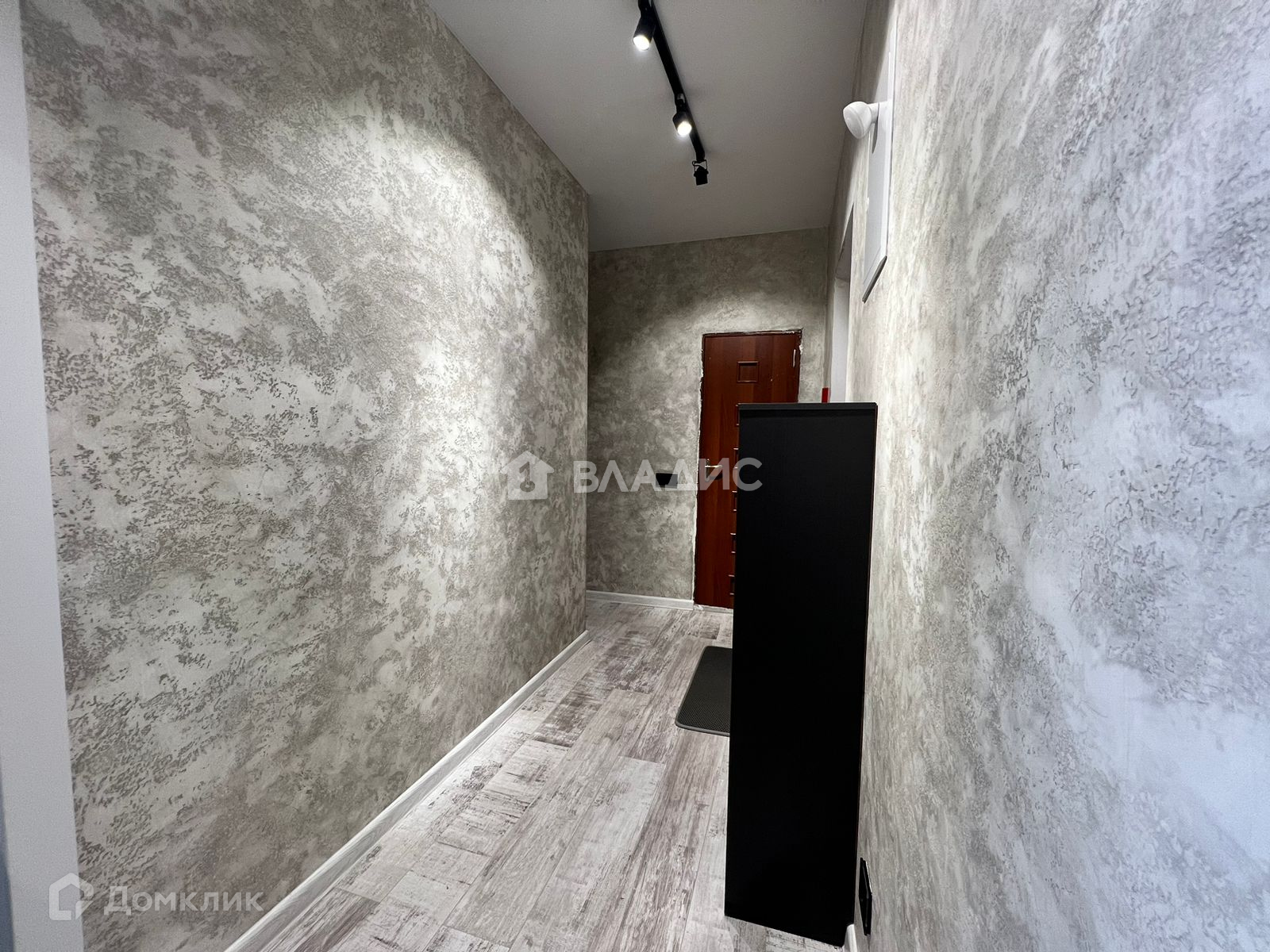 Коридор со встроенным шкафом-купе, стены в декоративной штукатурке, потолок натяжной, пол ламинат.