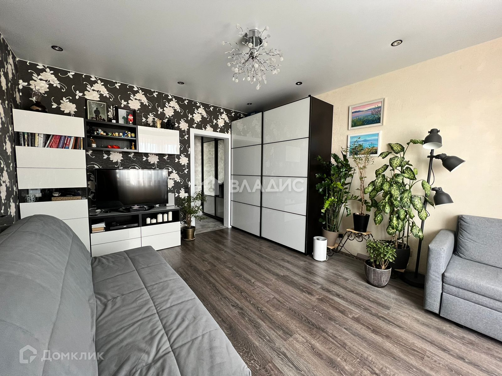 В комнате шкаф-купе, большой диван с матрасом «Askona» и небольшой стенкой. Пол - ламинат, потолок - натяжной.