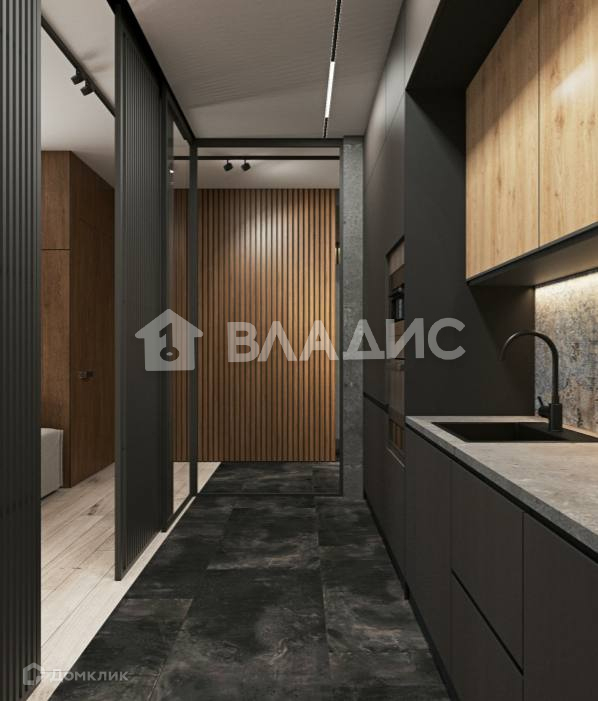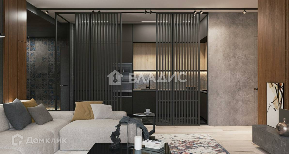 Кухня 7,1 квадратных метров объедена с гостиной 18,9 квадратных метров, кухня зонирована от зоны отдыха вертикальными жалюзи.