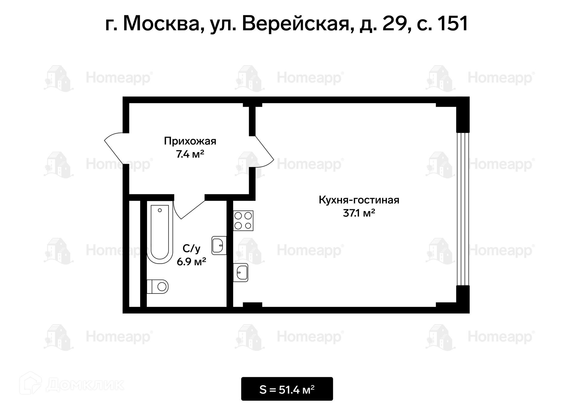 Общая площадь 51.4 м2