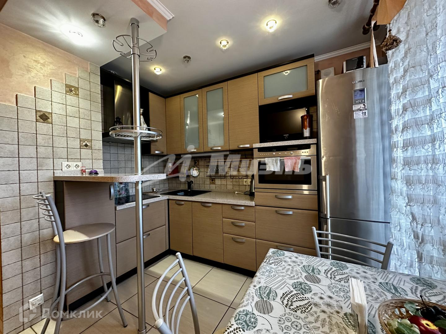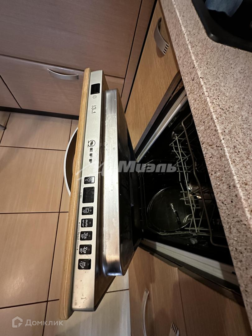 На кухне вся необходимая встроенная техника: посудомоечная машинка, духовой шкаф, варочная поверхность, вытяжка.