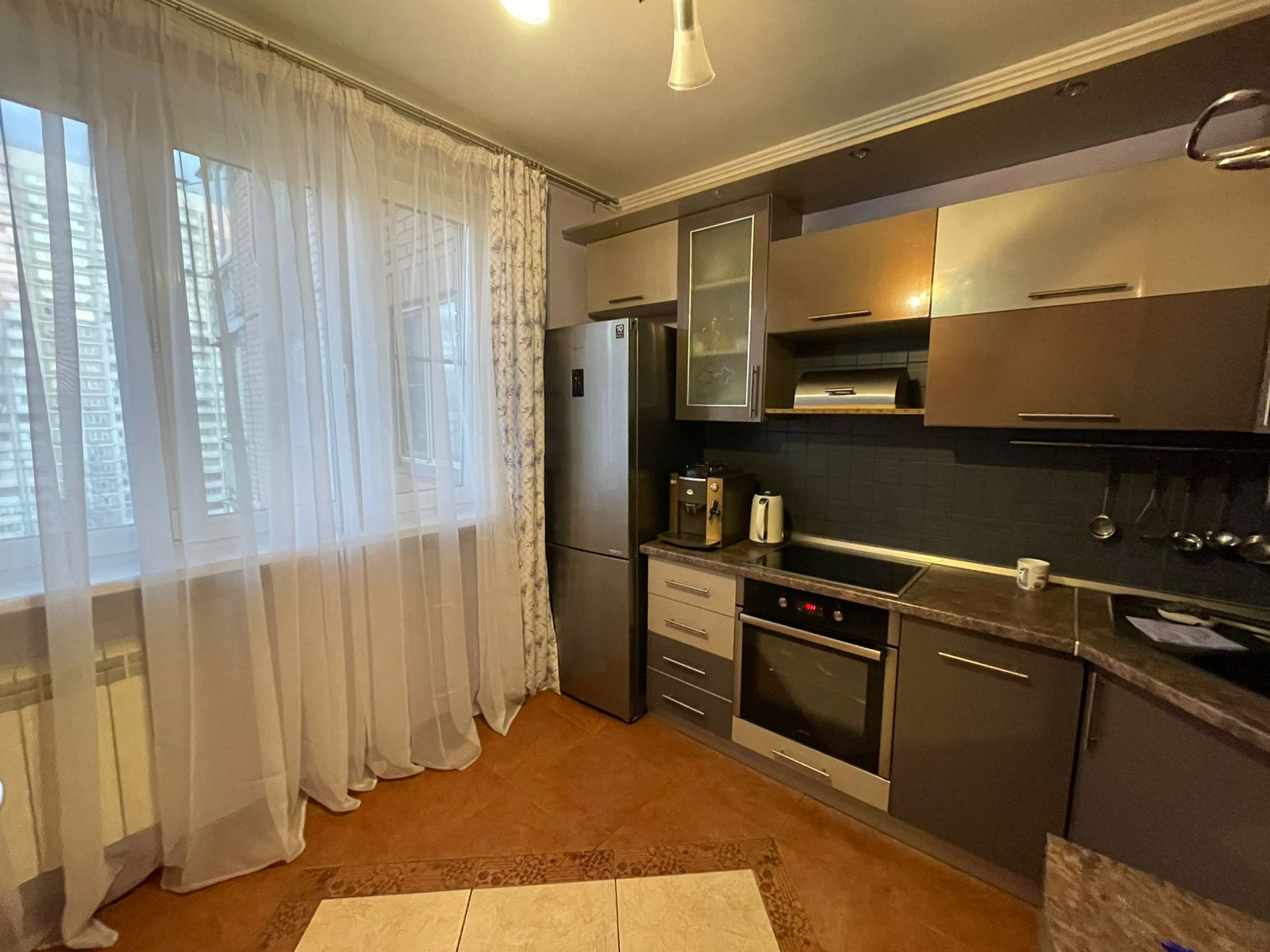 Современная инфраструктура: многообразие магазинов, торговые центры, Ашан, детские сады, школы. Окна выходят на детскую площадку, напротив подъезда новый детский сад.