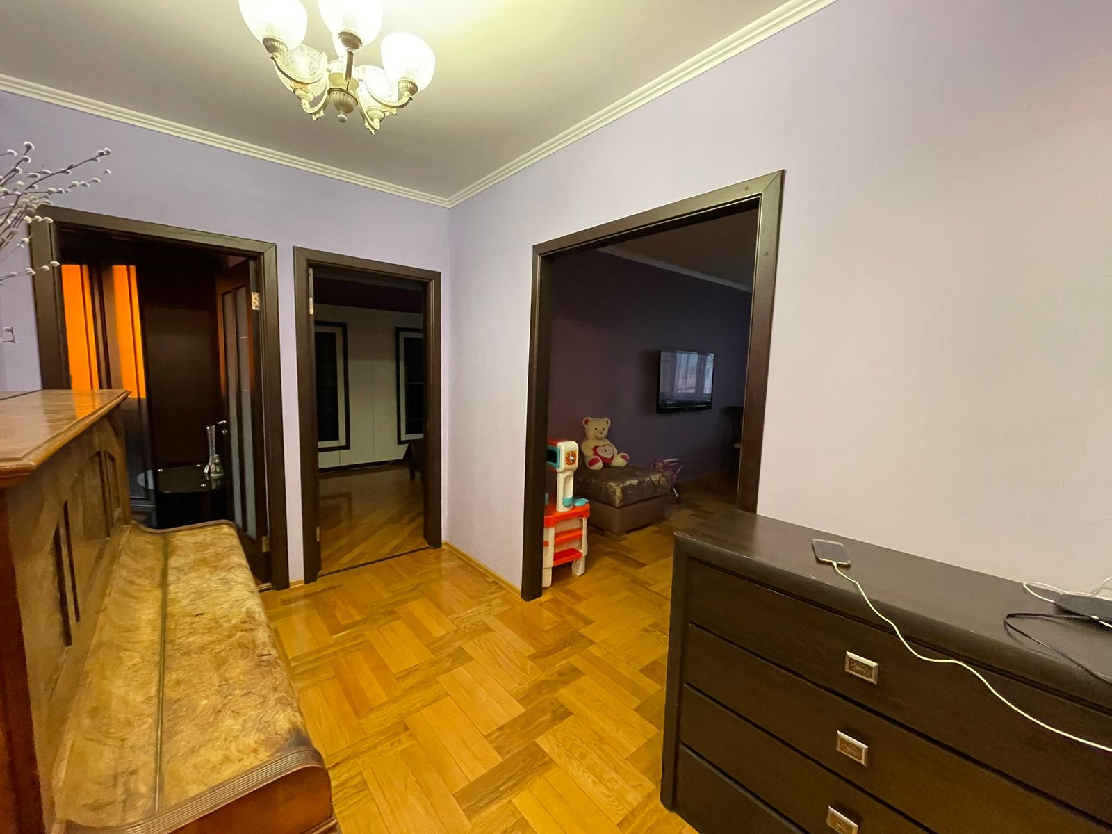 - Пространство квартиры правильно спланировано и функционально оснащено. Квартира просторная, светлая, распашная, окна выходят на разные стороны. При входе Вас встретит комфортная входная группа с просторной гардеробной в виде шкаф-купе по всему коридору. По всему периметру жилой зоны, напольное покрытие выполнено из румынского паркета;