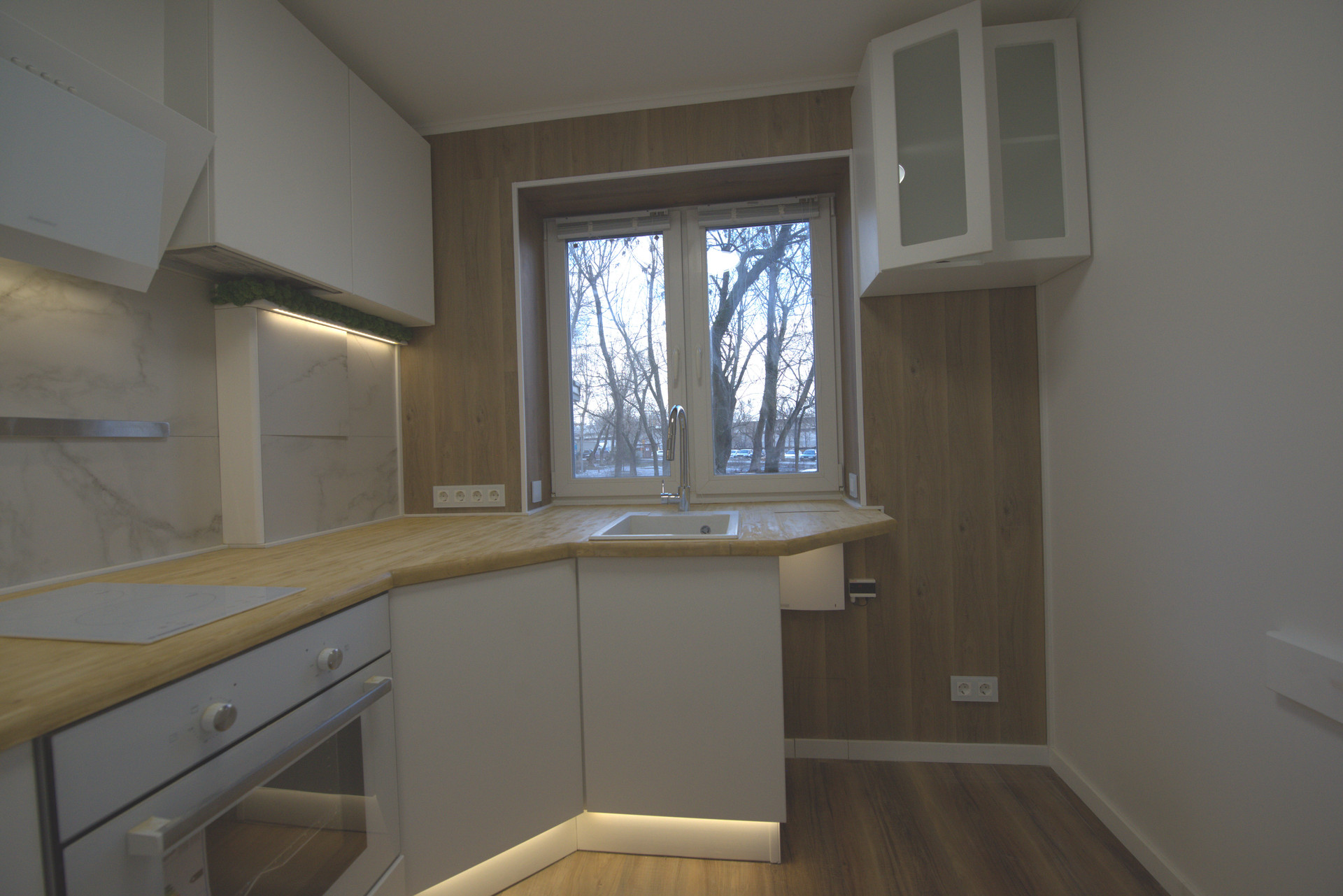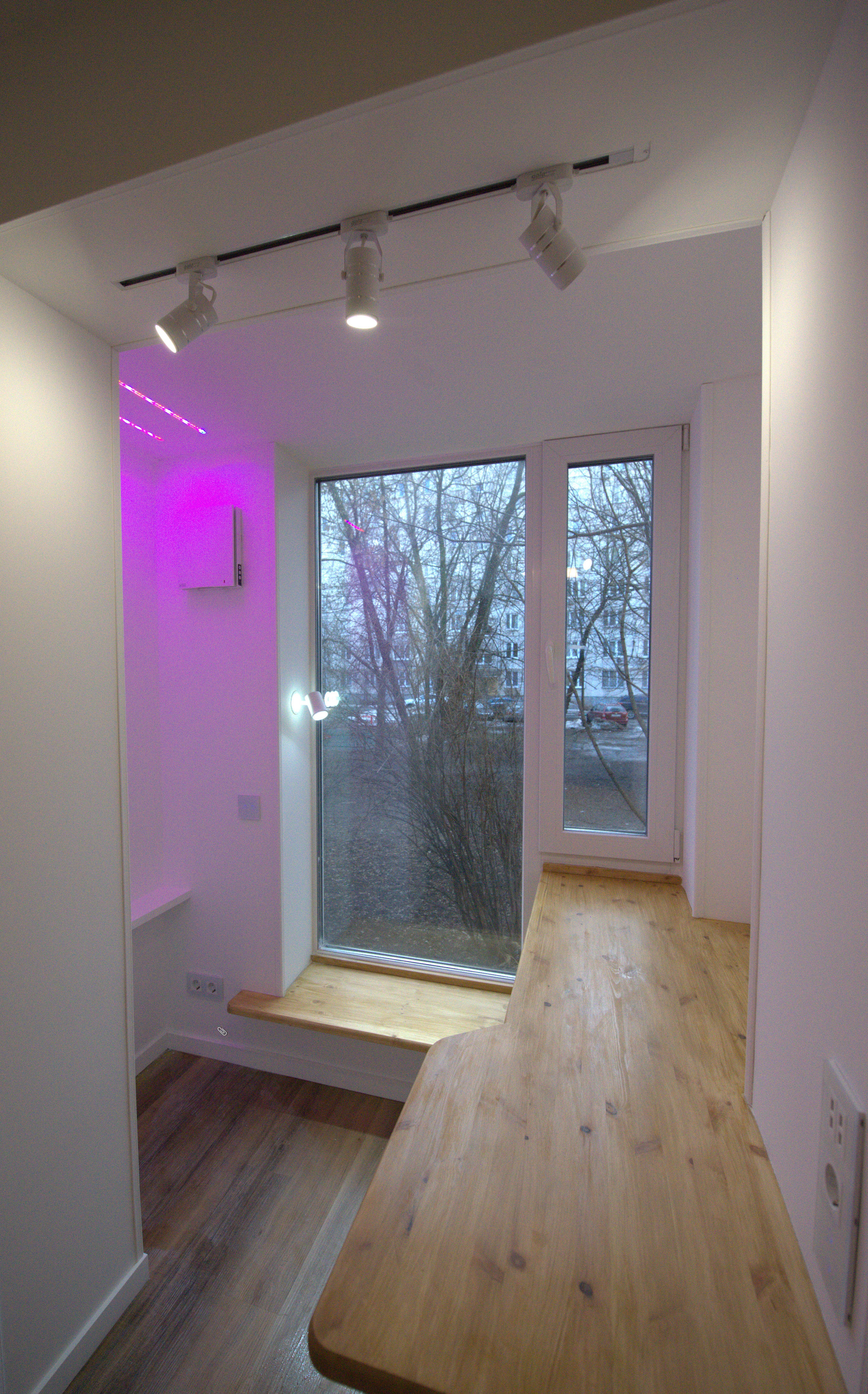 - теплый пол (3 контура), стяжка, кварц-виниловое покрытие единым контуром без порогов;