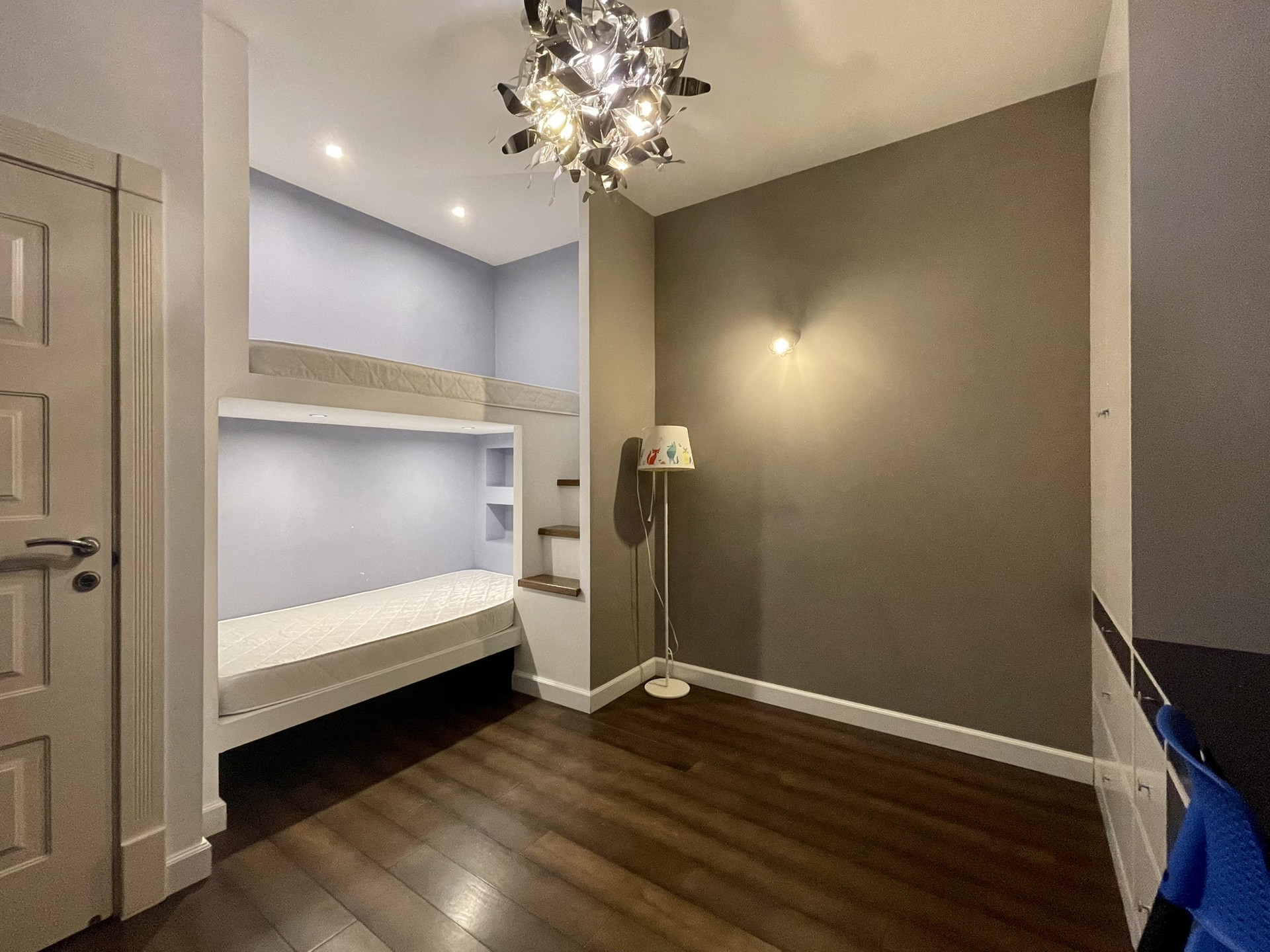 Подростковая - двухярусная встроенная кровать с 2-мя матрасами, шкафы + стол (делались на заказ под размеры)