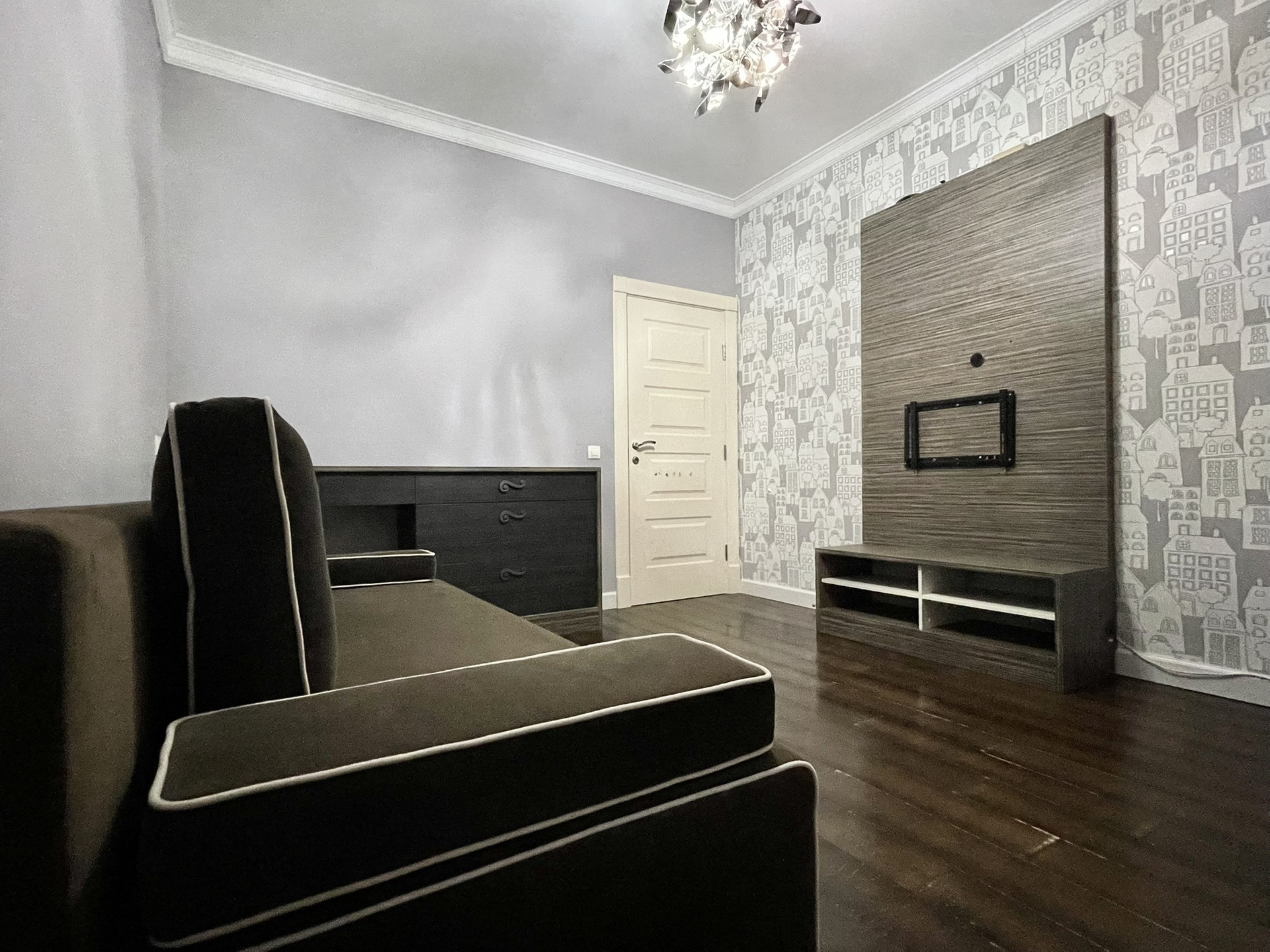 Зал - встроенные полки под телевизор, камин, диван, кресло