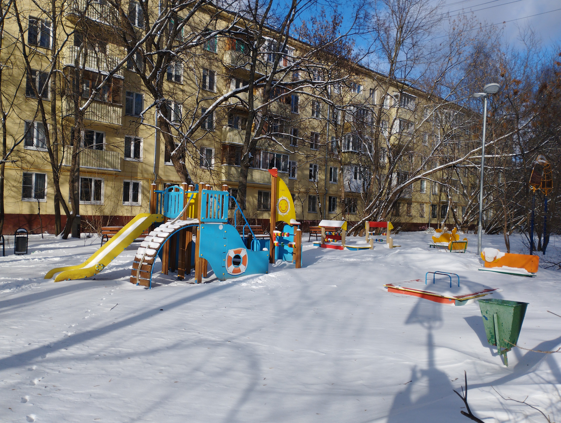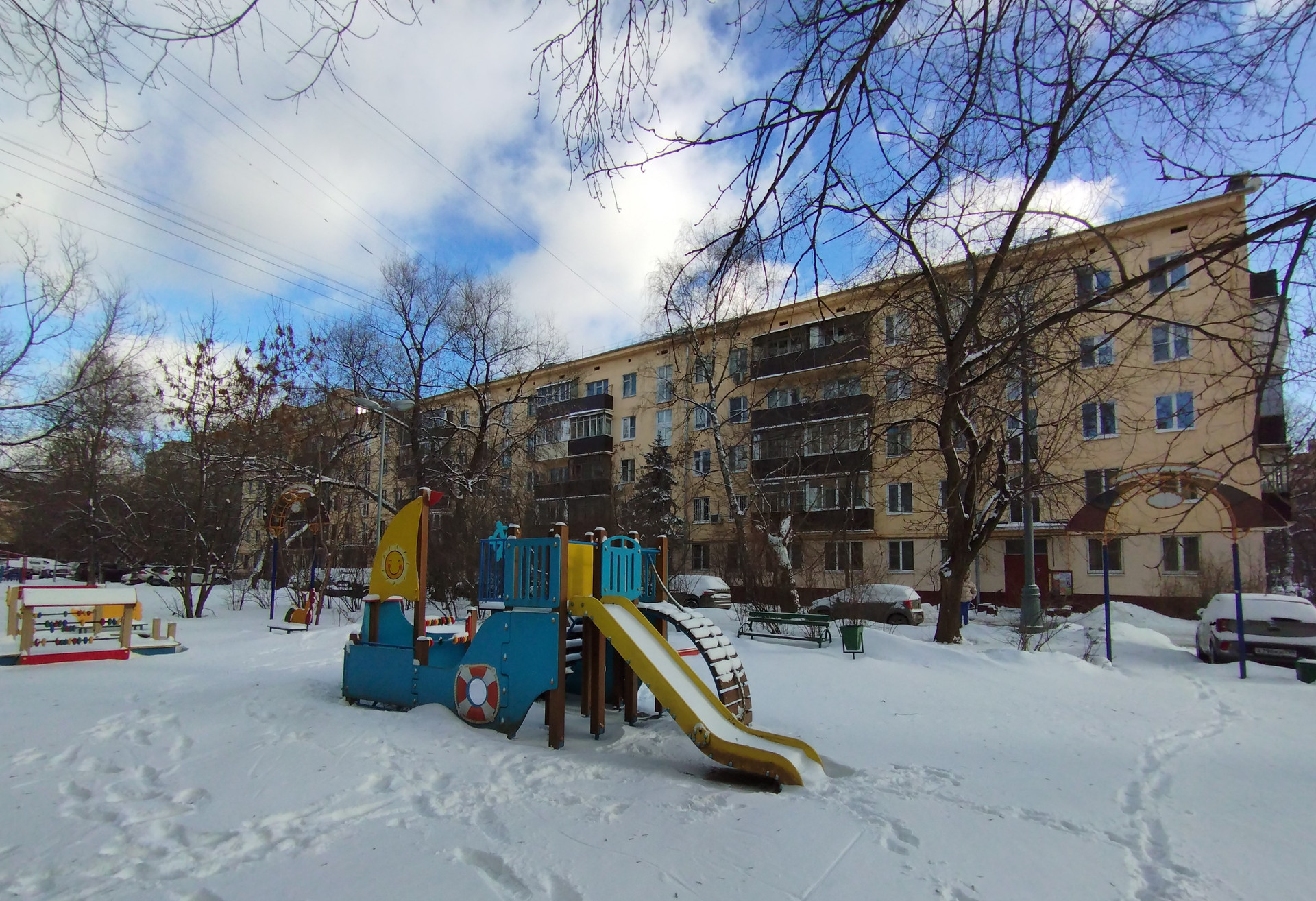 В зеленом дворе есть детская площадка, скамейки, парковочные места. Въезд во двор возможен только для жильцов дома, с обеих сторон закрыт шлагбаумом.