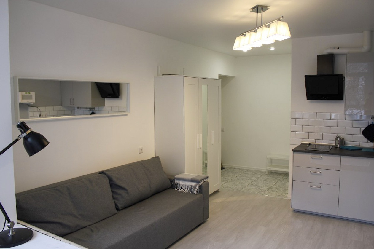 Квартира-студия со своим сан.узлом, зоной кухни, отдельные счетчики на воду, металлическая дверь. 20,5 кв.м на 1/8 эт. кирпичного дома , высота потолков 3 метра. Окно комнаты выходит на улицу.