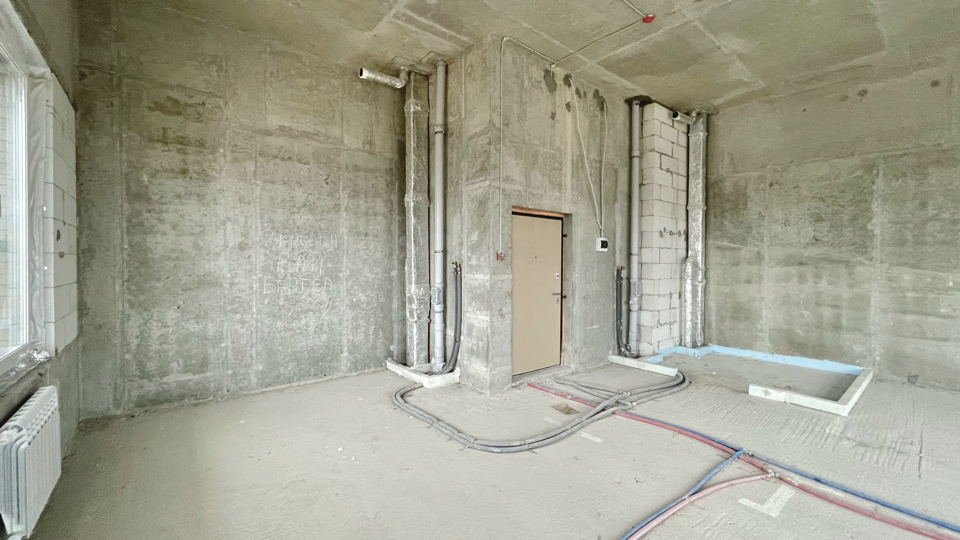 Свободная планировка, в которой можно реализовать проект с просторной кухней-гостей и спальней, либо с кухней и двумя изолированными комнатами.