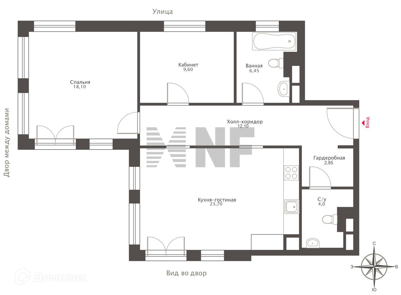 Планировка: гостиная-кухня, изолированная спальня, кабинет, ванная комната, гостевой санузел-постирочная.