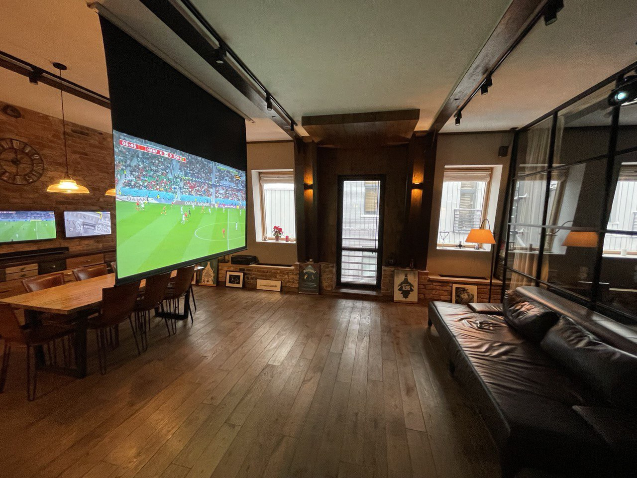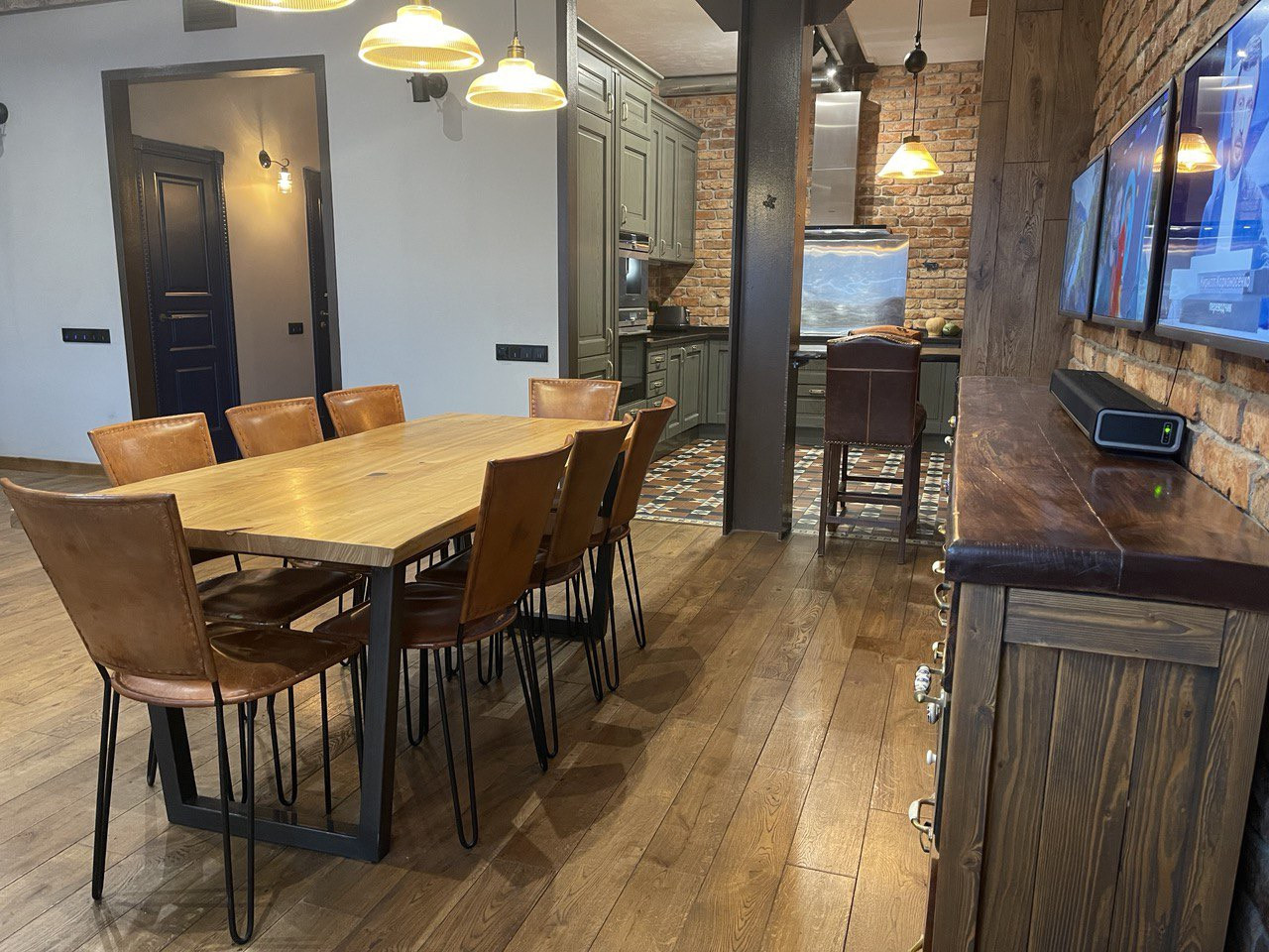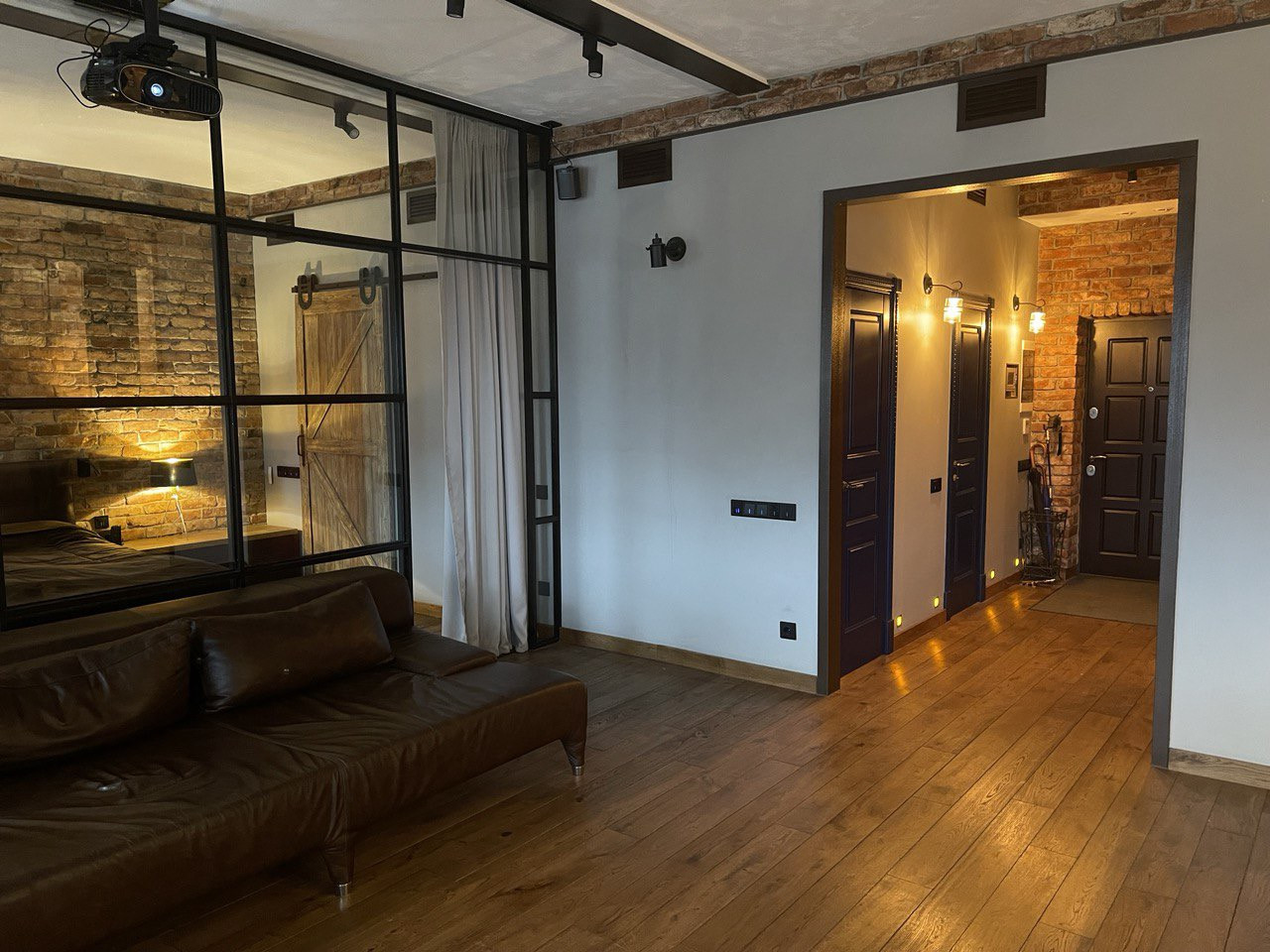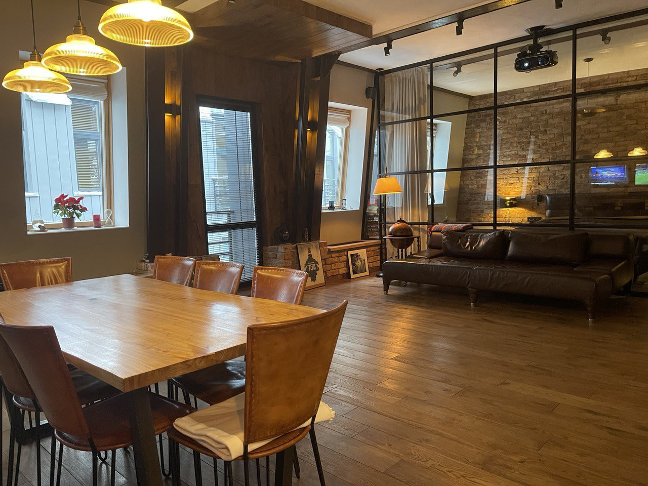 Просторная прихожая со встроенными, сделанными на заказ шкафами, гостевой санузел. Площадь гостиной, столовой зоны и кухни превышает 57 (!) кв. метров, выход из гостиной на французский балкон. Встроенная итальянская кухня полностью укомплектована качественной немецкой техникой, включая гриль. Все элементы интерьера - дубовый стол с кожаными стульями, кожаный диван, тумба под телевизорами, практически каждый элемент - сделаны на заказ. Домашний кинотеатр с высококачественным проектором.
