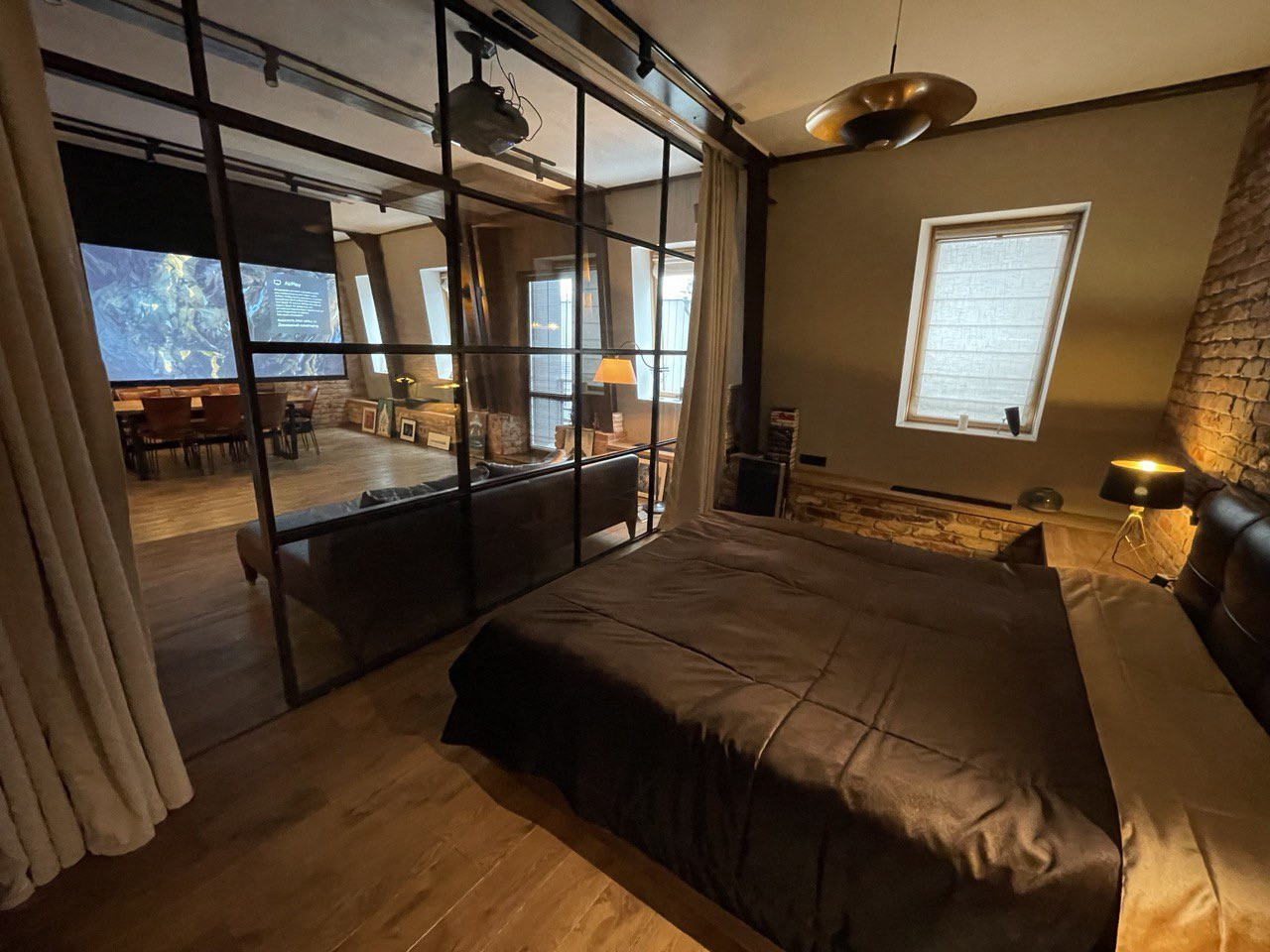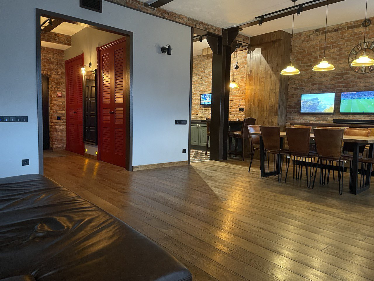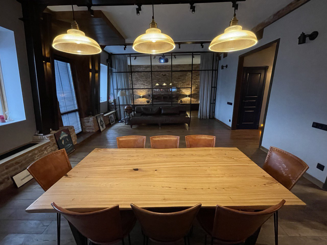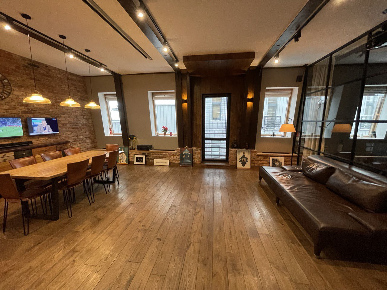 Просторная прихожая со встроенными, сделанными на заказ шкафами, гостевой санузел. Площадь гостиной, столовой зоны и кухни превышает 57 (!) кв. метров, выход из гостиной на французский балкон. Встроенная итальянская кухня полностью укомплектована качественной немецкой техникой, включая гриль. Все элементы интерьера - дубовый стол с кожаными стульями, кожаный диван, тумба под телевизорами, практически каждый элемент - сделаны на заказ. Домашний кинотеатр с высококачественным проектором.