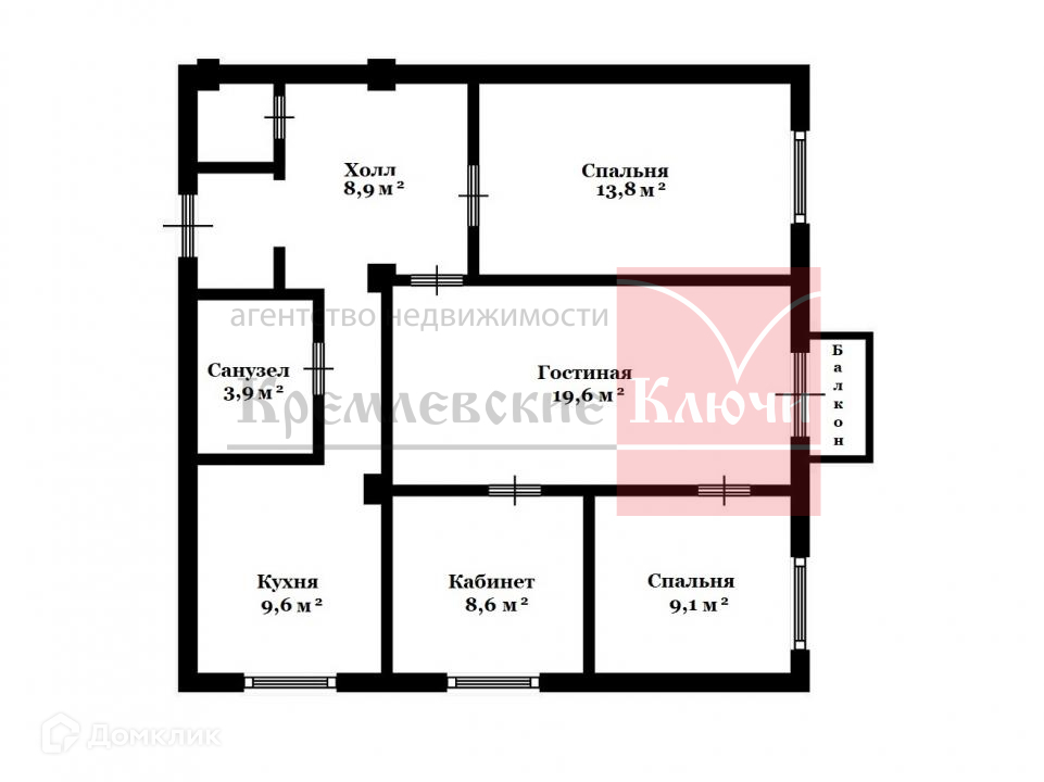 Комнаты смежно-изолированные: (14 м2 спальня -19.6 м2 гостиная +9.1 м2 спальня +8.6 м2 кабинет). Кухня 9.6 м2, есть балкон, много мест для хранения, есть небольшая кладовка, CУ/С.