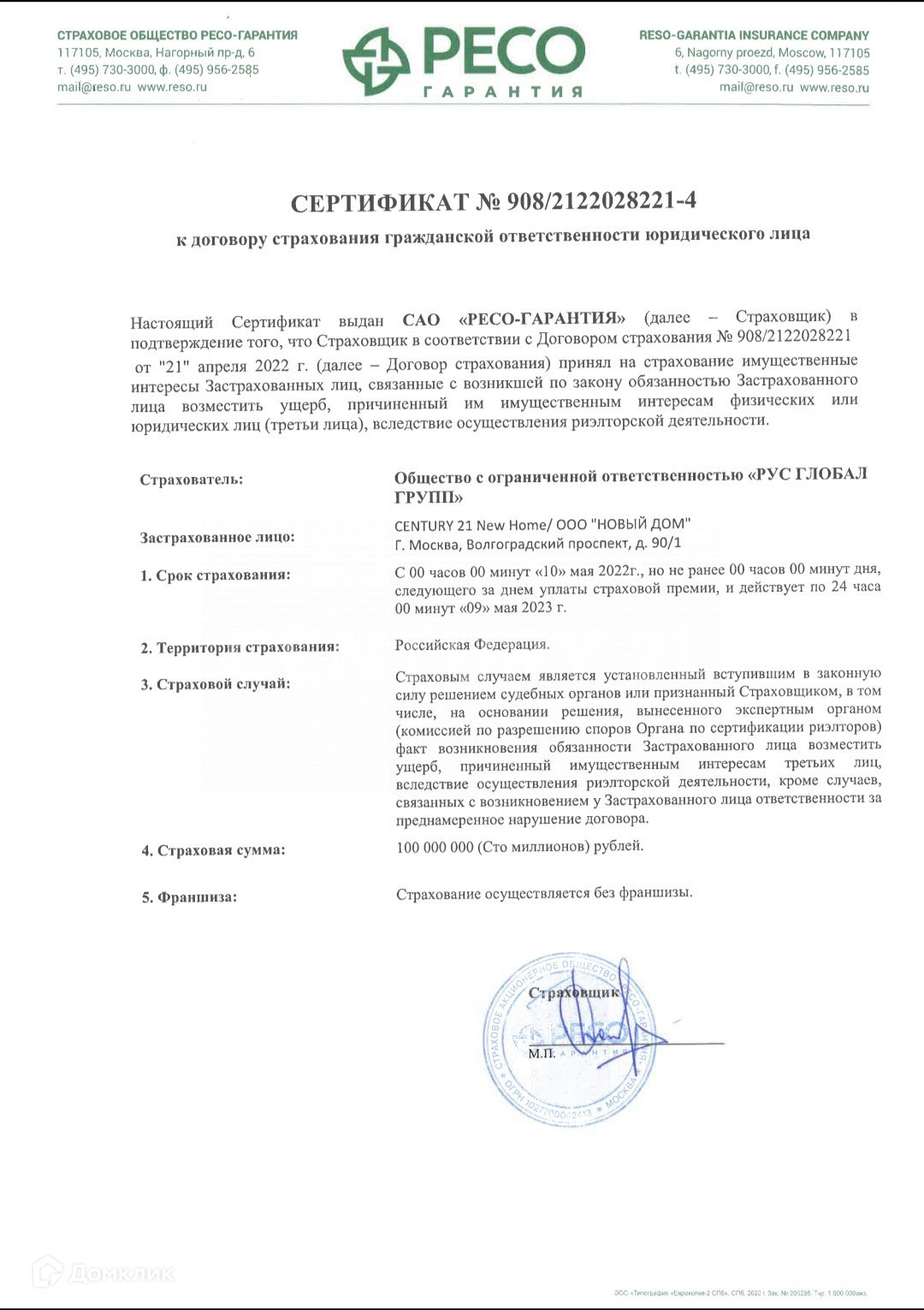 Профессиональная деятельность застрахованна на 100.000.000. рублей!