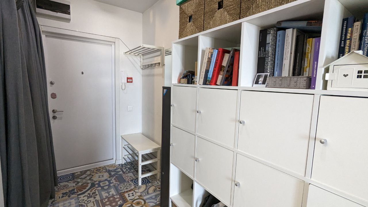 В квартире есть гардеробная. Раздвижные двери между кухней и комнатой позволяют разделить пространство и не препятствуют проникновению света, визуально не дробя помещение. Окна комнаты и кухни выходят на восток, прямо на рассвет. В квартире всё это время проживала одна семья, без домашних животных. Кухня Ikea, духовой шкаф, варочная панель и стиральная машина марки AEG, встроенный в перегородку между кухней и комнатой экран для проектора, встроенная в стену раскладная кровать 200x210 см. – функциональная часть этой студии.