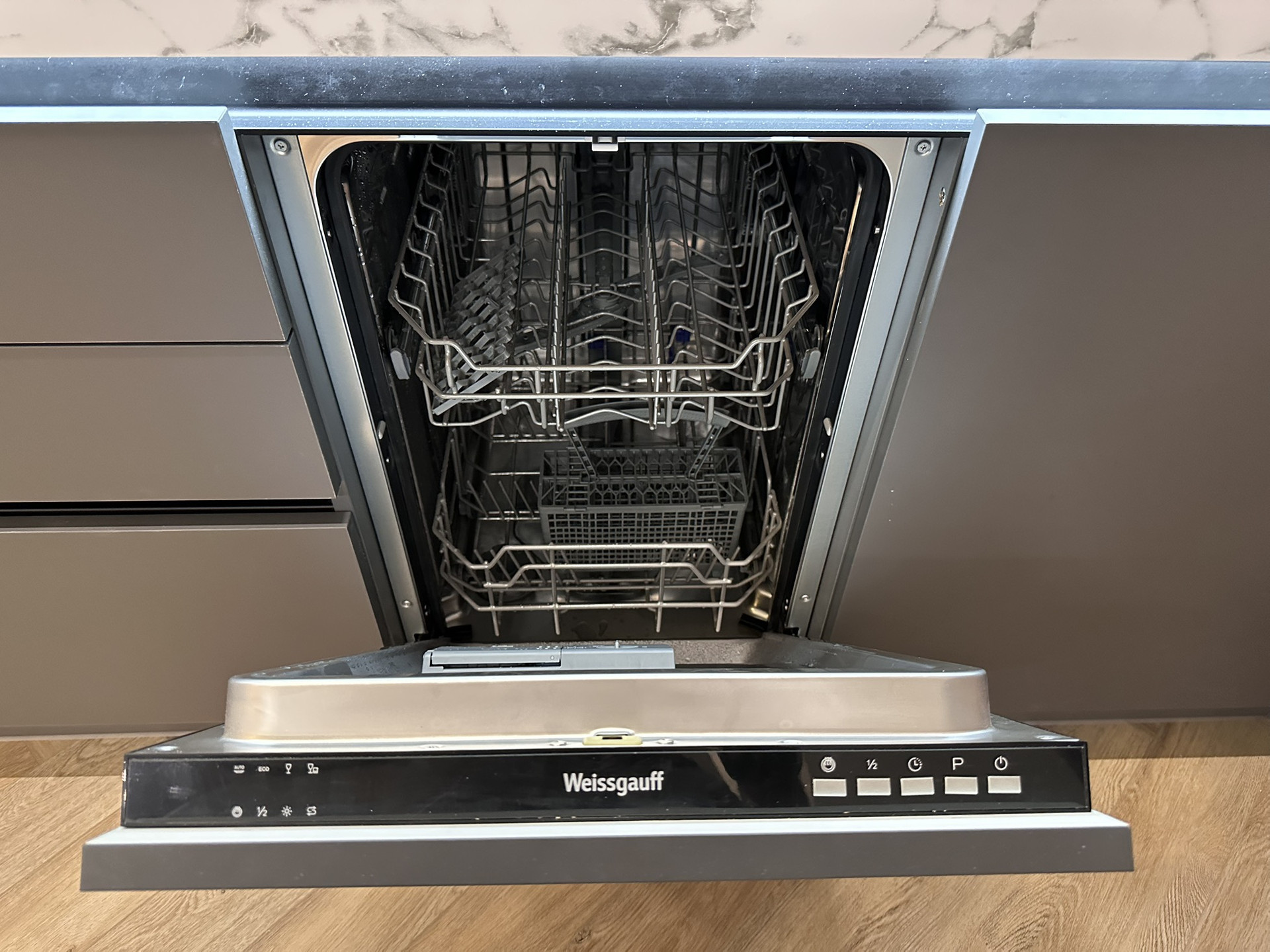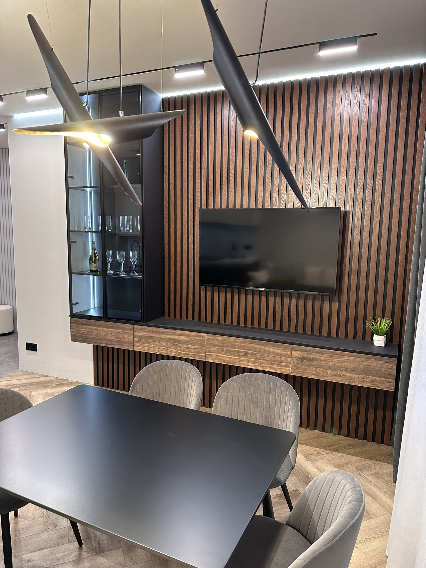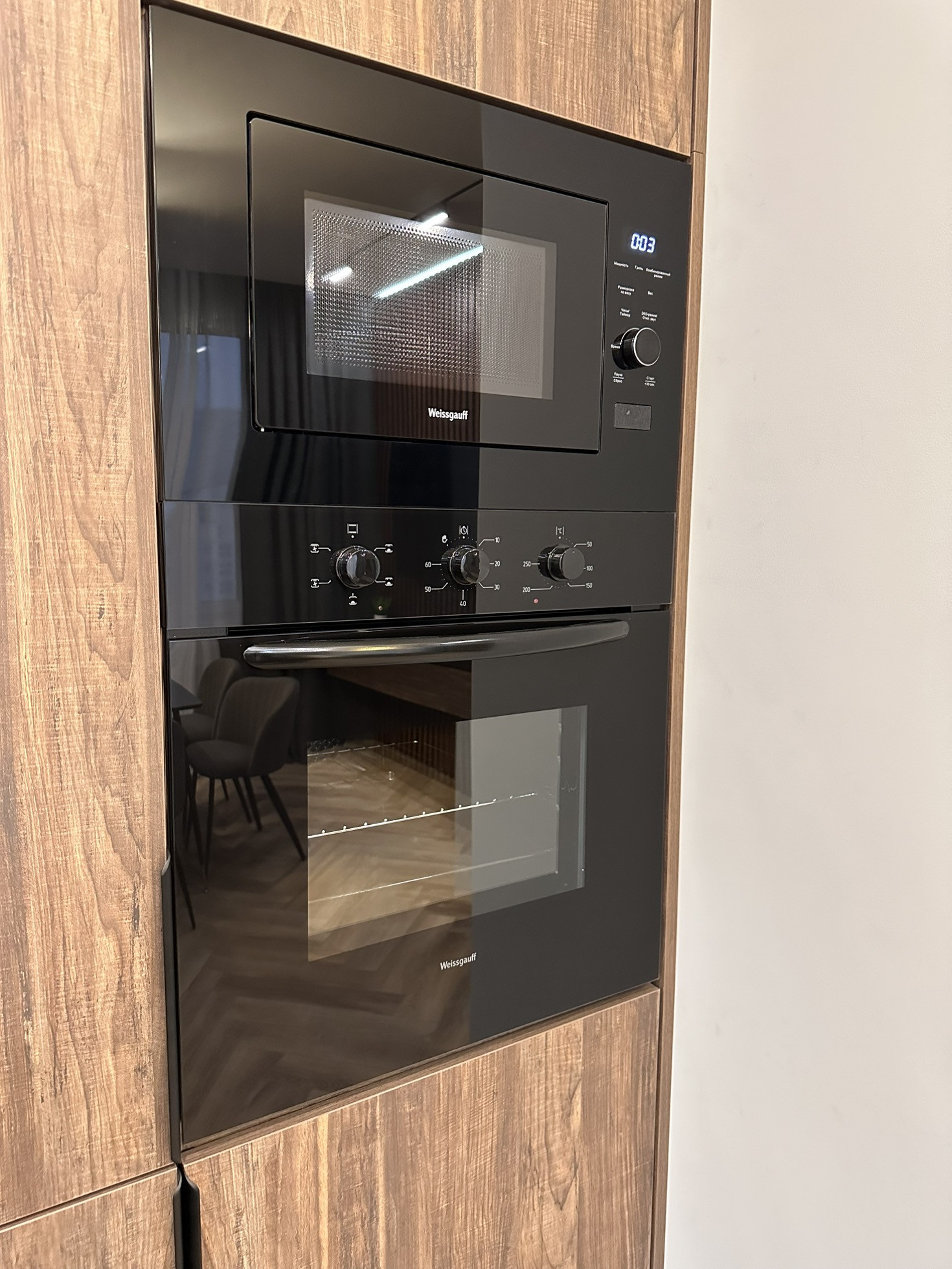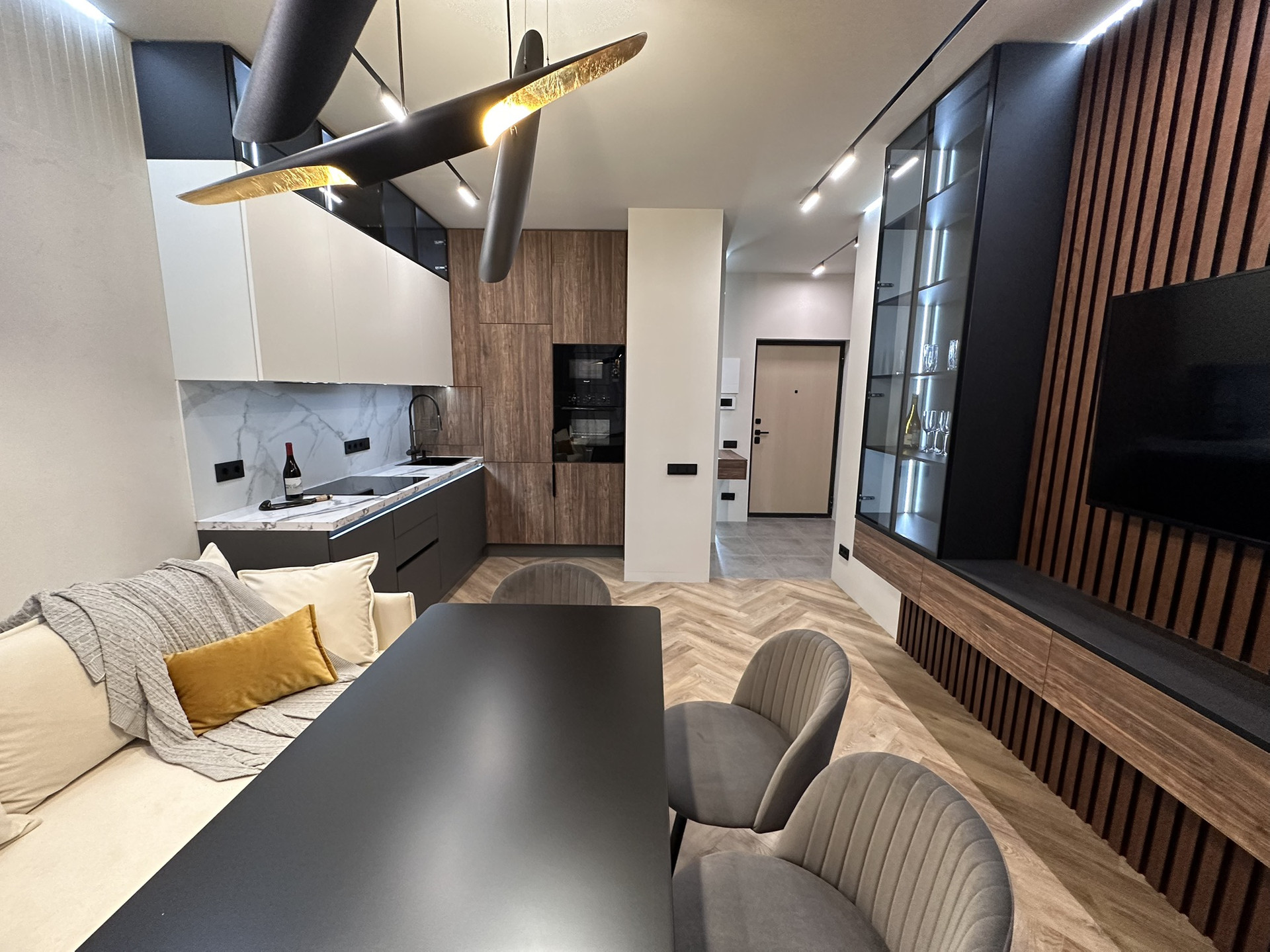 Кухня выполнена на заказ по индивидуальному проекту из современных материалов премиального класса (алюминий, эмаль, стекло) фурнитура Blum (Австрия). В кухню встроены: посудомоечная машина, вытяжка, варочная индукционная панель, свч, духовой шкаф, стиральная машина с сушкой, вся техника Weissgauff. 50 дюймовый телевизор Panasonic.