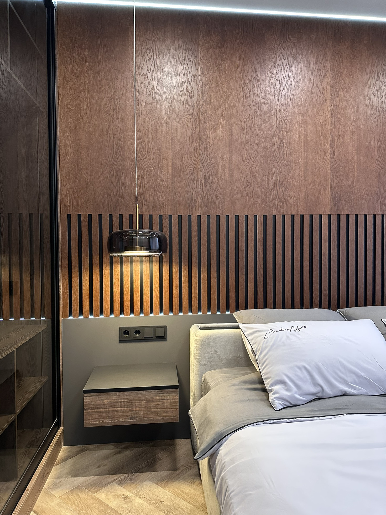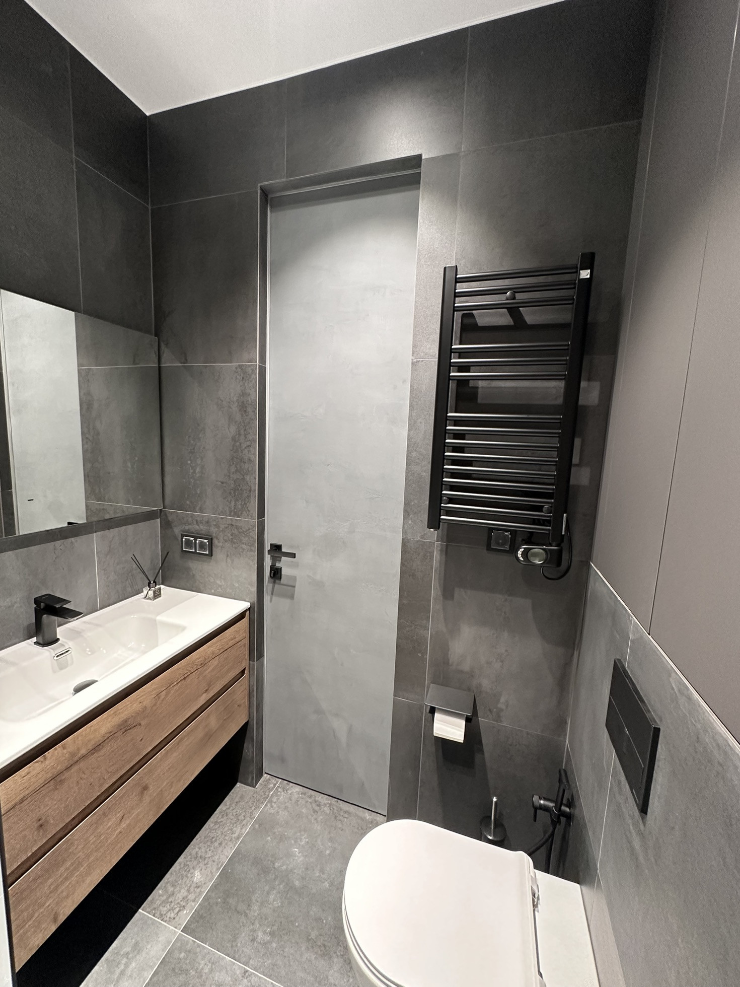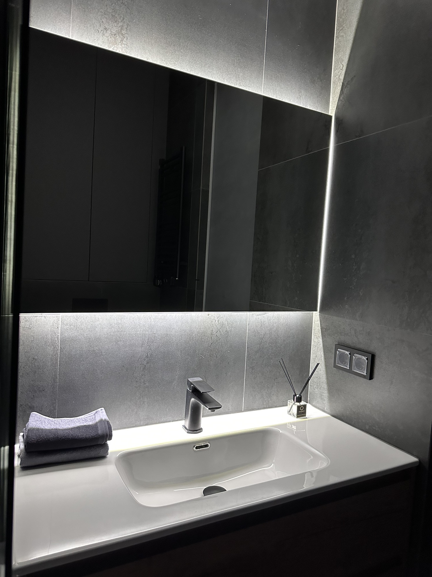 В коридоре установлен видеодомофон Bas ip, встроенный шкаф, зеркало в пол с подсветкой.