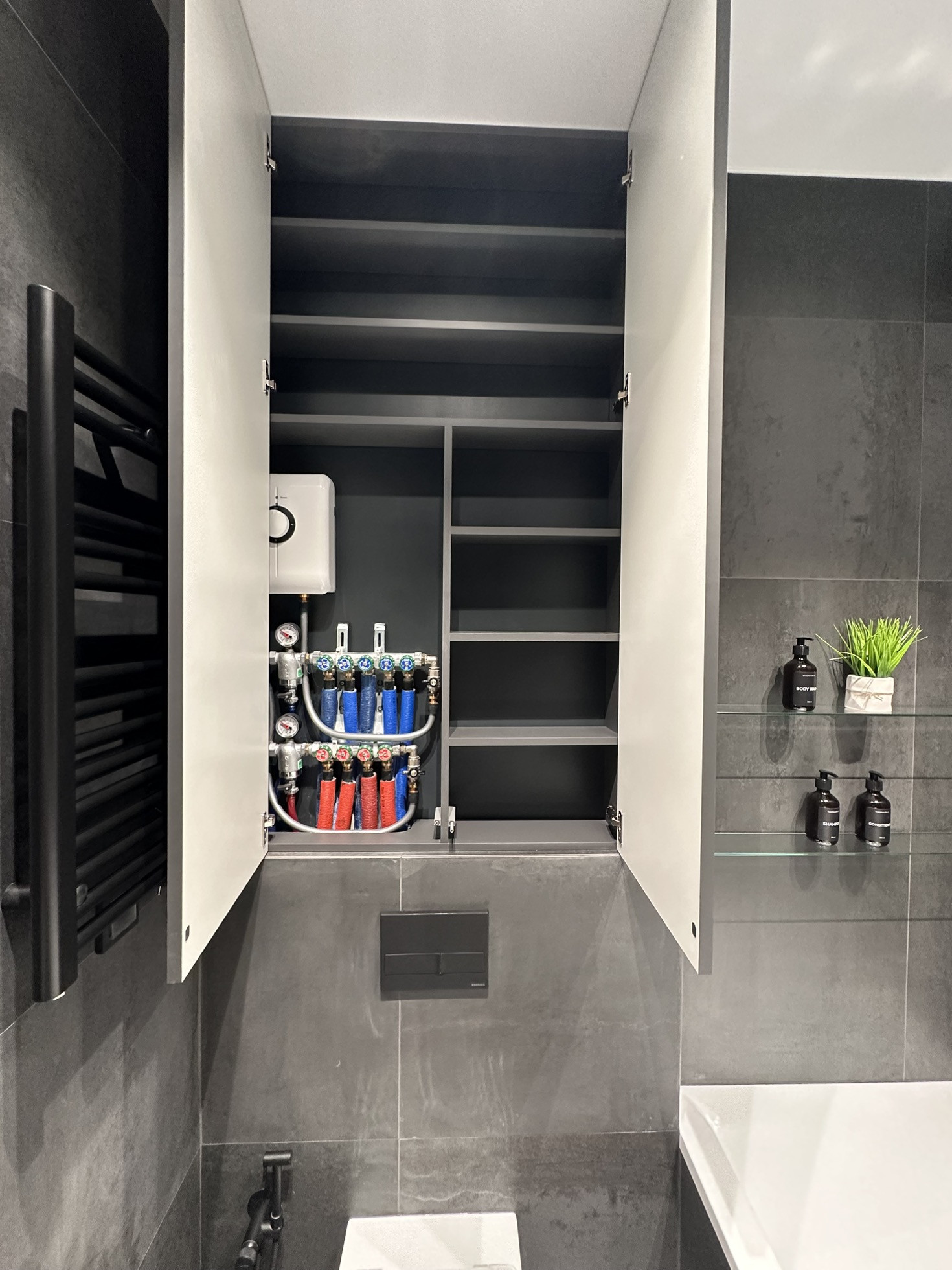 В ванной комнате установлена качественная сантехника немецких брендов Allen brau, Berges, Vagnerplast, водонагреватель Stiebel eltron, гигиенический душ, разводка труб по квартире полиэтилен Rehau.
