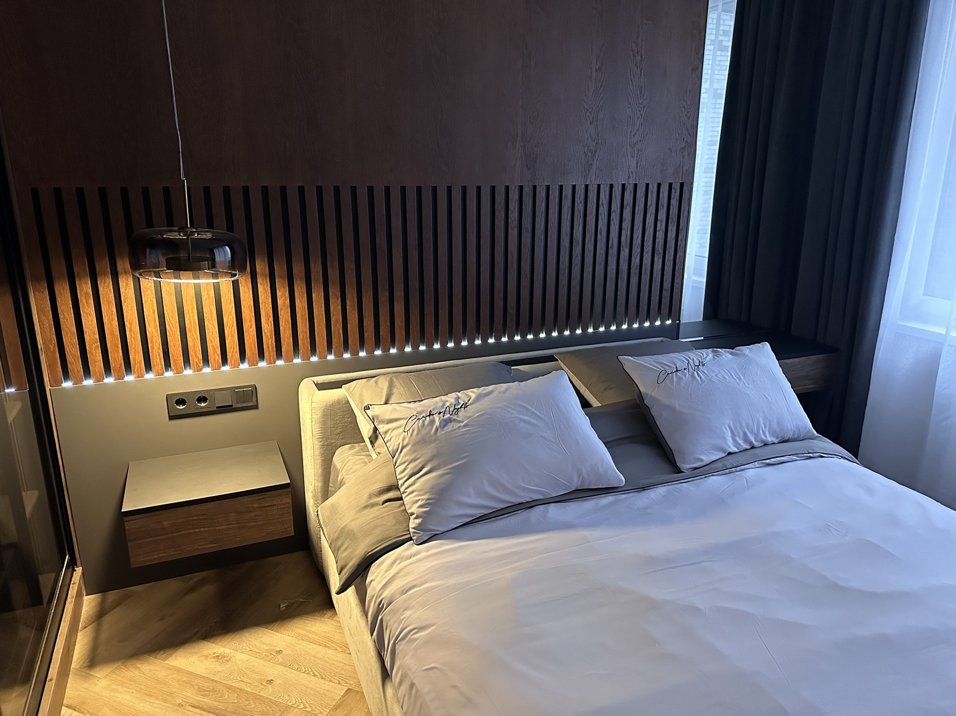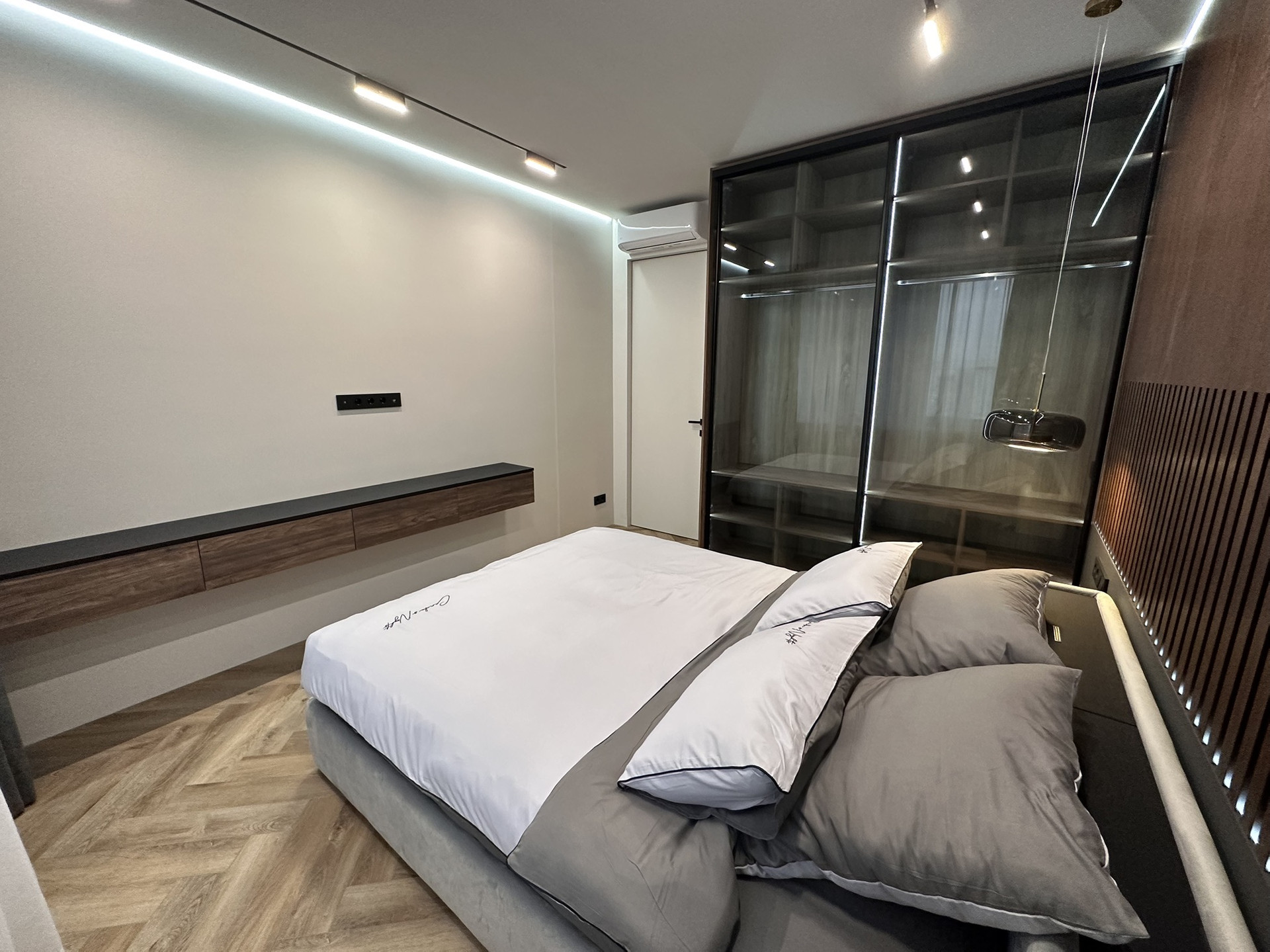 В каждой комнате установлены кондиционеры Funai (Япония). В квартире можно задать несколько различных сценариев трекового освещения. Электрика немецких брендов Schneider Electric, автоматы Abb на каждую группу отдельно.