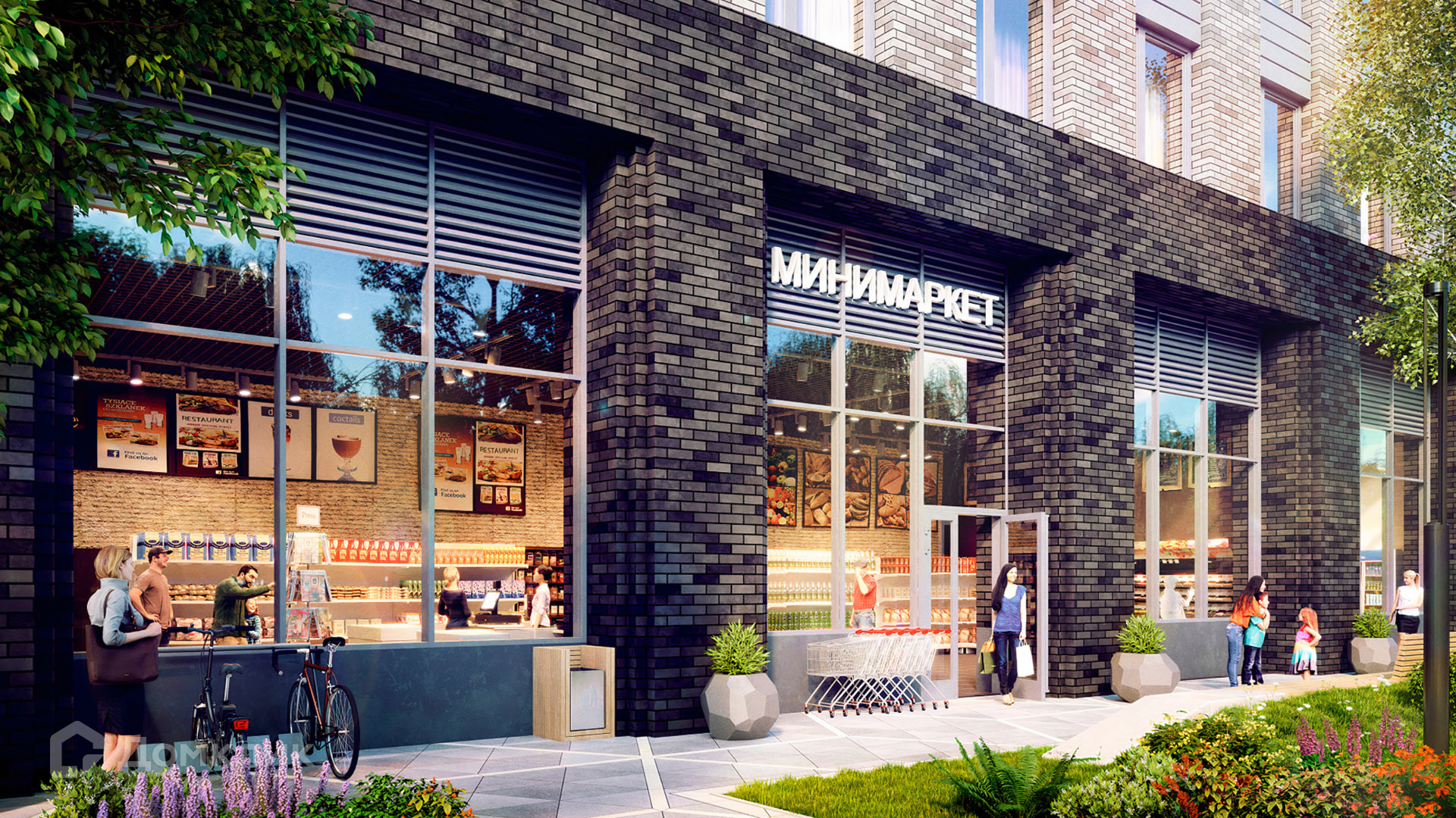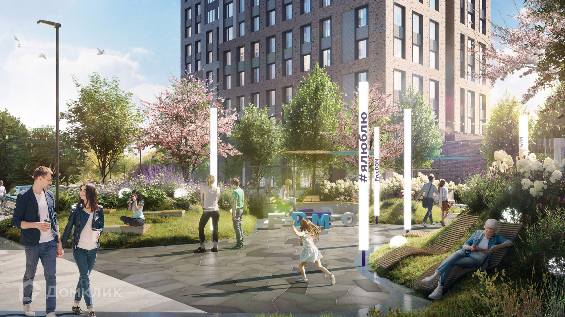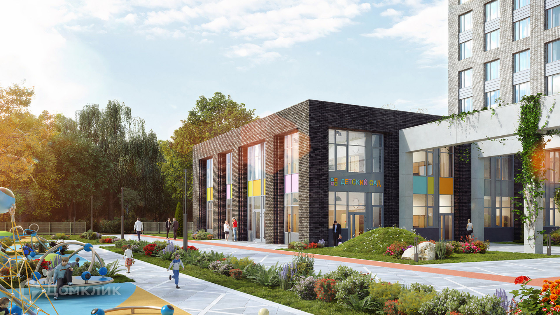 Вся территория комплекса представляет собой приватный двор, который разбит на отдельные зоны — детский городок, фонтан в окружении зеленых насаждений и скамеек, спортивная площадка, кафетерий. Всюду можно воспользоваться wi-fi и зарядными станциями для гаджетов. Для юных жителей построен детский сад, взрослые могут потренироваться в любое время в спортивном зале без покупки абонемента.