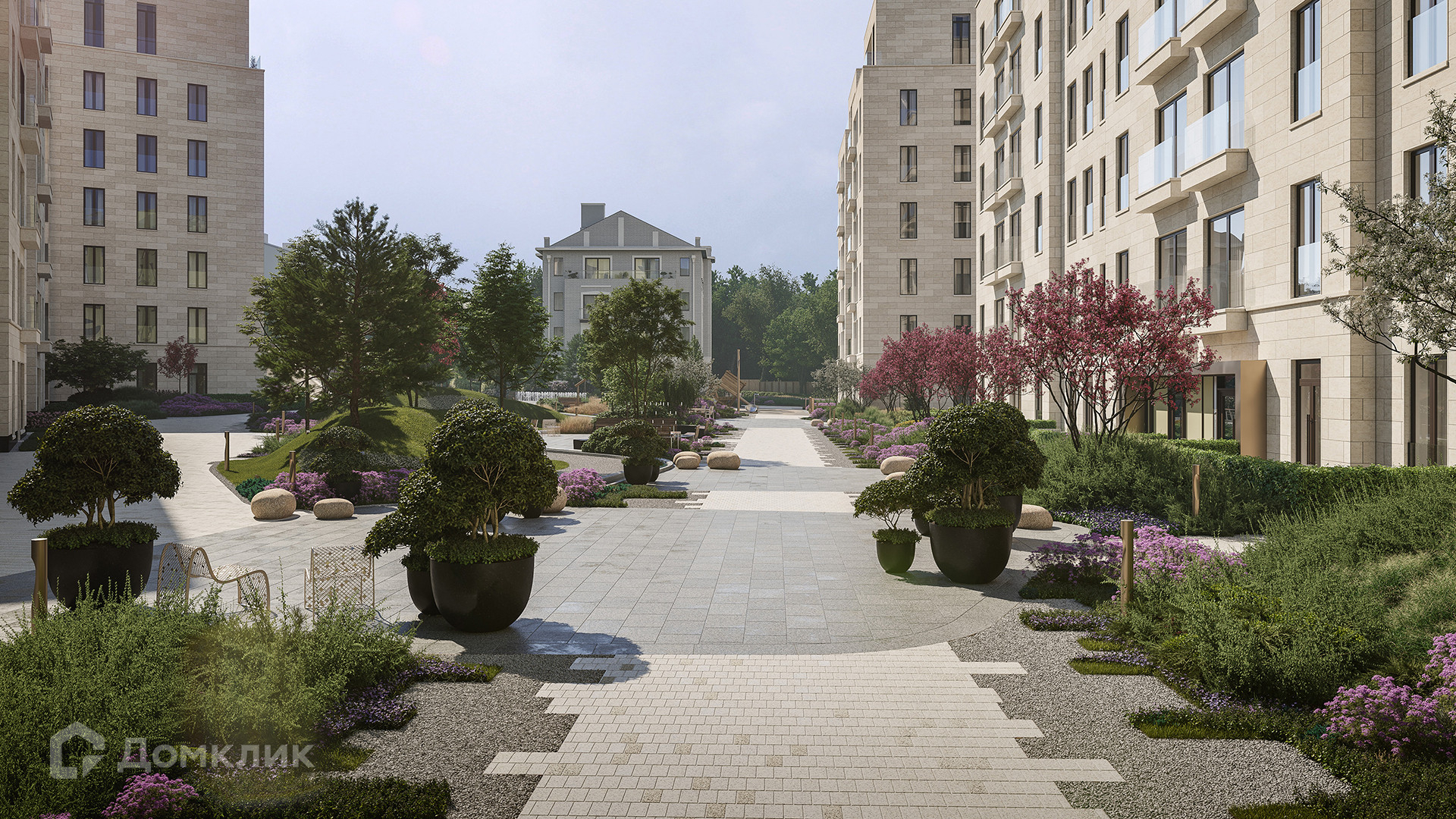 Ландшафтный дизайн разработала студия Gillespies. Сад комплекса объединяет детские площадки, зеленые аллеи и живописные лаунж-зоны. Неглубокий ручей в центре сада приносит в проект атмосферу загородной недвижимости. Зона ритейла включает продуктовые магазины, кафе, рестораны, салоны красоты и частный детский сад.