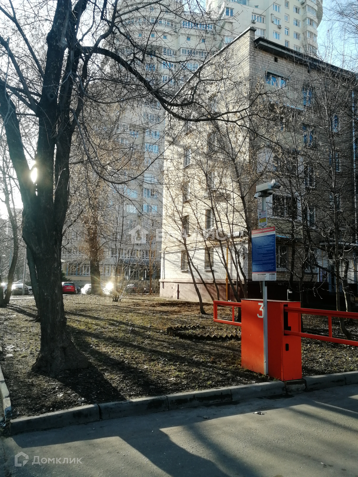 Тихий зелёный двор закрыт шлагбаумом.