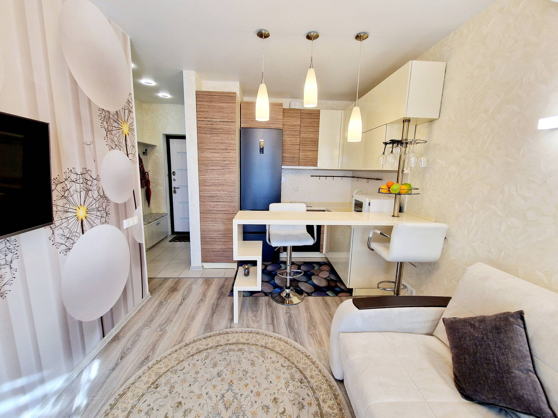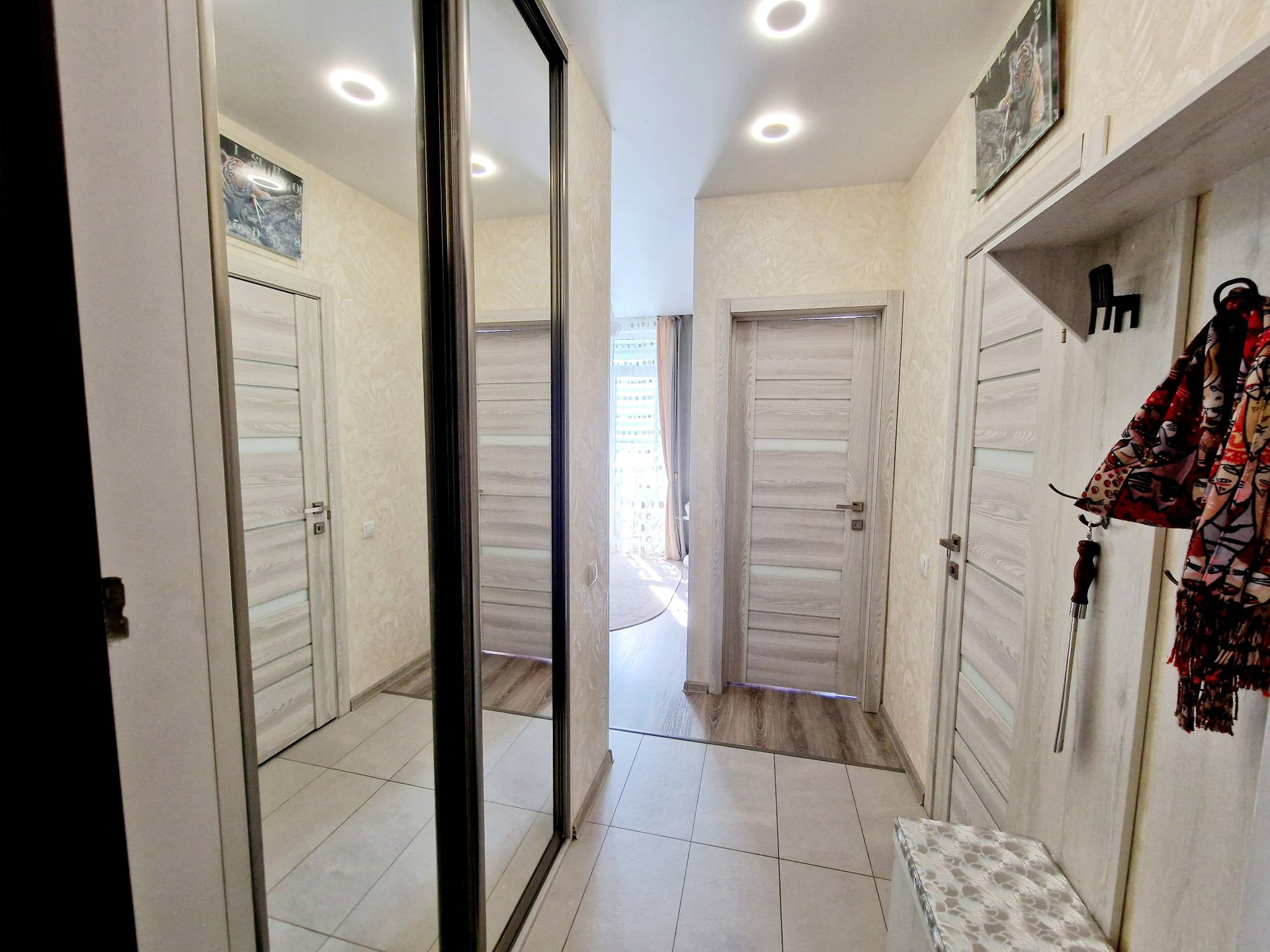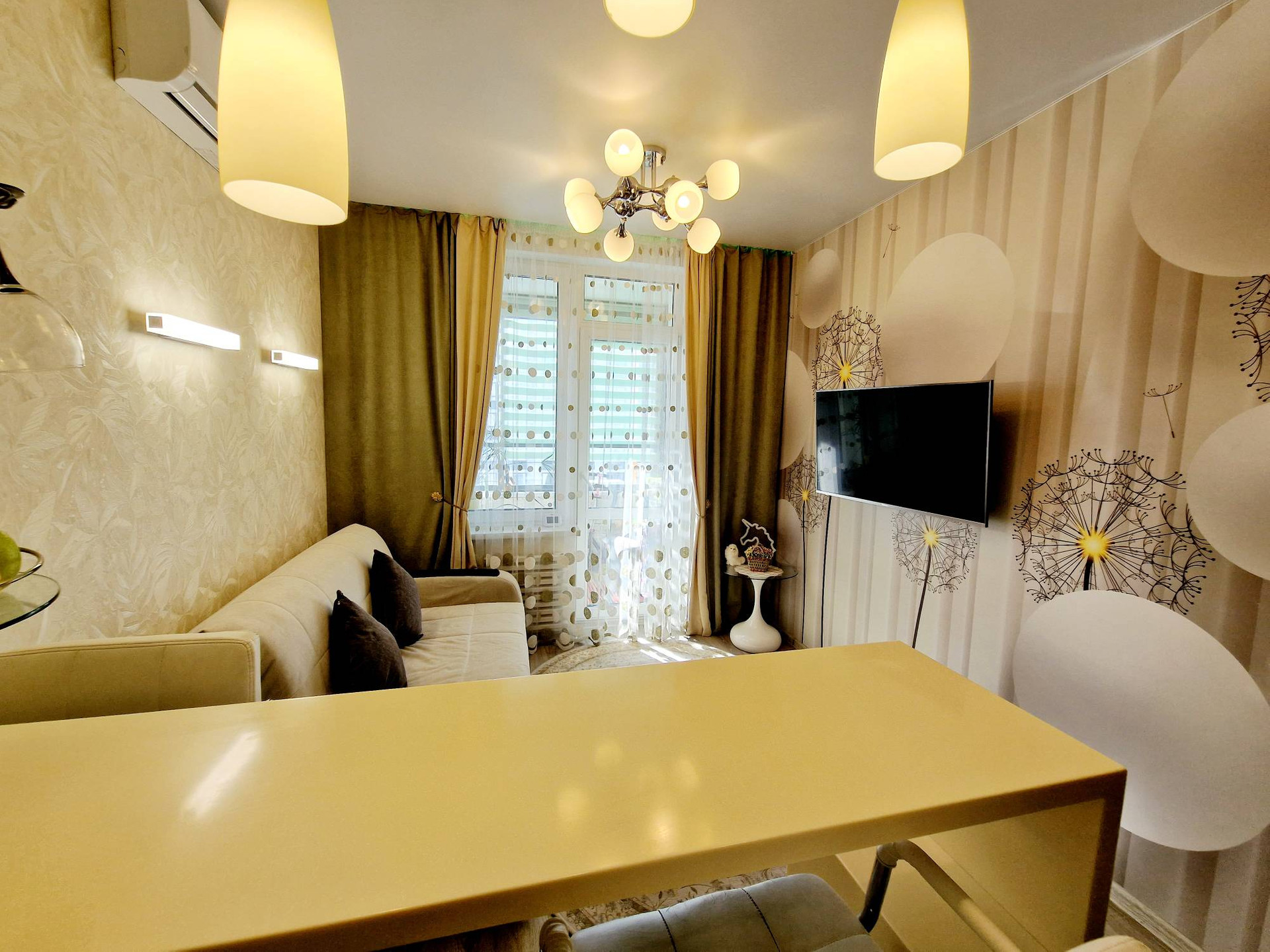 Квартира с качественным дизайнерским ремонтом: стены - обои, на полу ламинат/ плитка, много разнообразного освещения, немецкие радиаторы отопления.