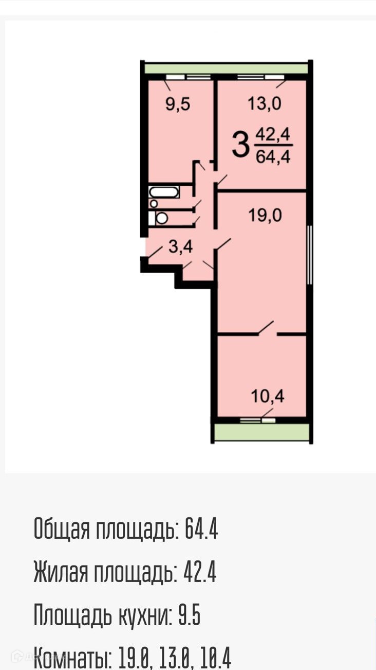 Общая площадь 64.4 м2