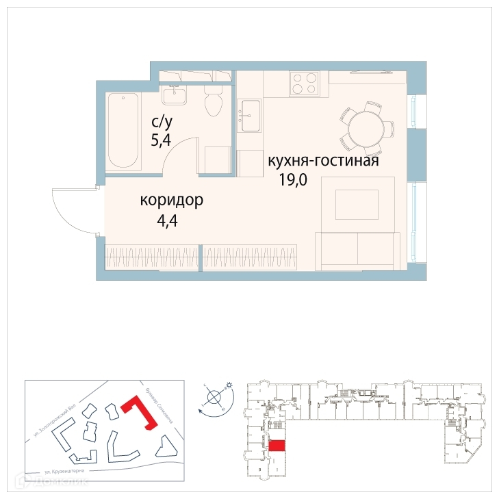 Квартира студия, 28.8 м2, этаж 4 / 27, на продажу в Москве, улица Золоторожский Вал, 11с20