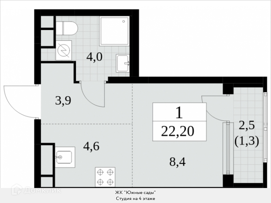 Продаю однокомнатную квартиру-студию площадью 22.2 кв.м., без отделки, на 4 этаже из 30 в жилом комплексе комфорт-класса "Южные сады". В квартире изолированные комнаты, а все окна выходят на одну сторону. В квартире один балкон, один совмещенный санузел. Высота потолков 2.87 м.