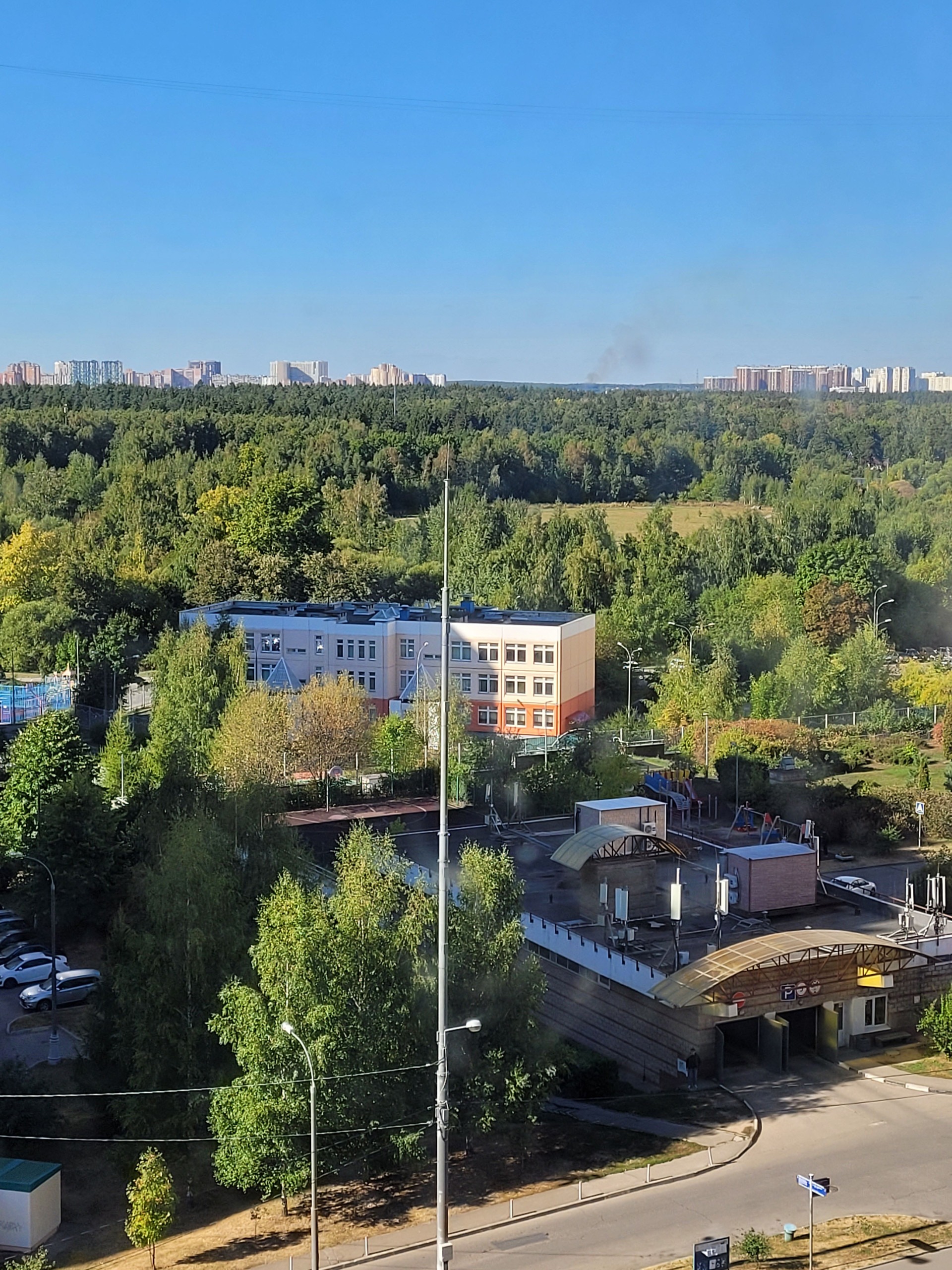 Через дорогу ухоженный парк 21 га, с ручьём, утками, белками и бобрами, с дорожками, лавочками, игровыми площадками. Всегда очень свежий воздух.
