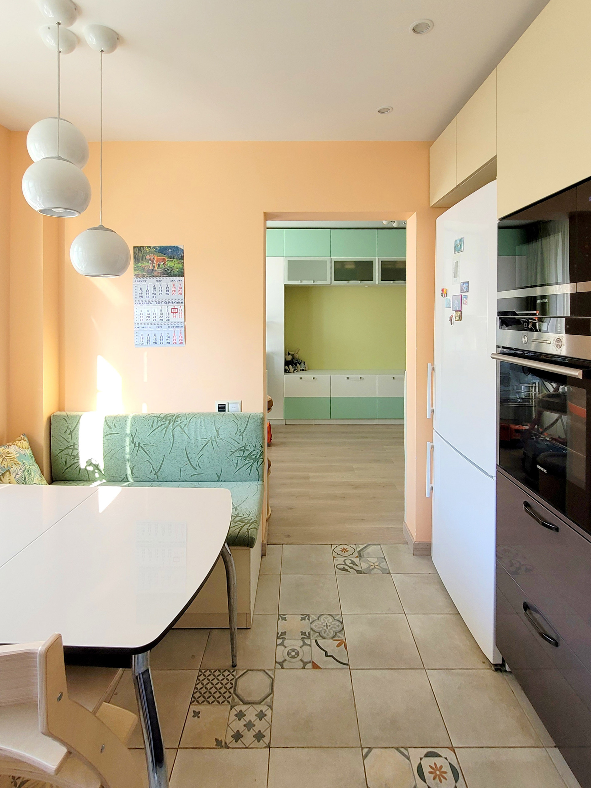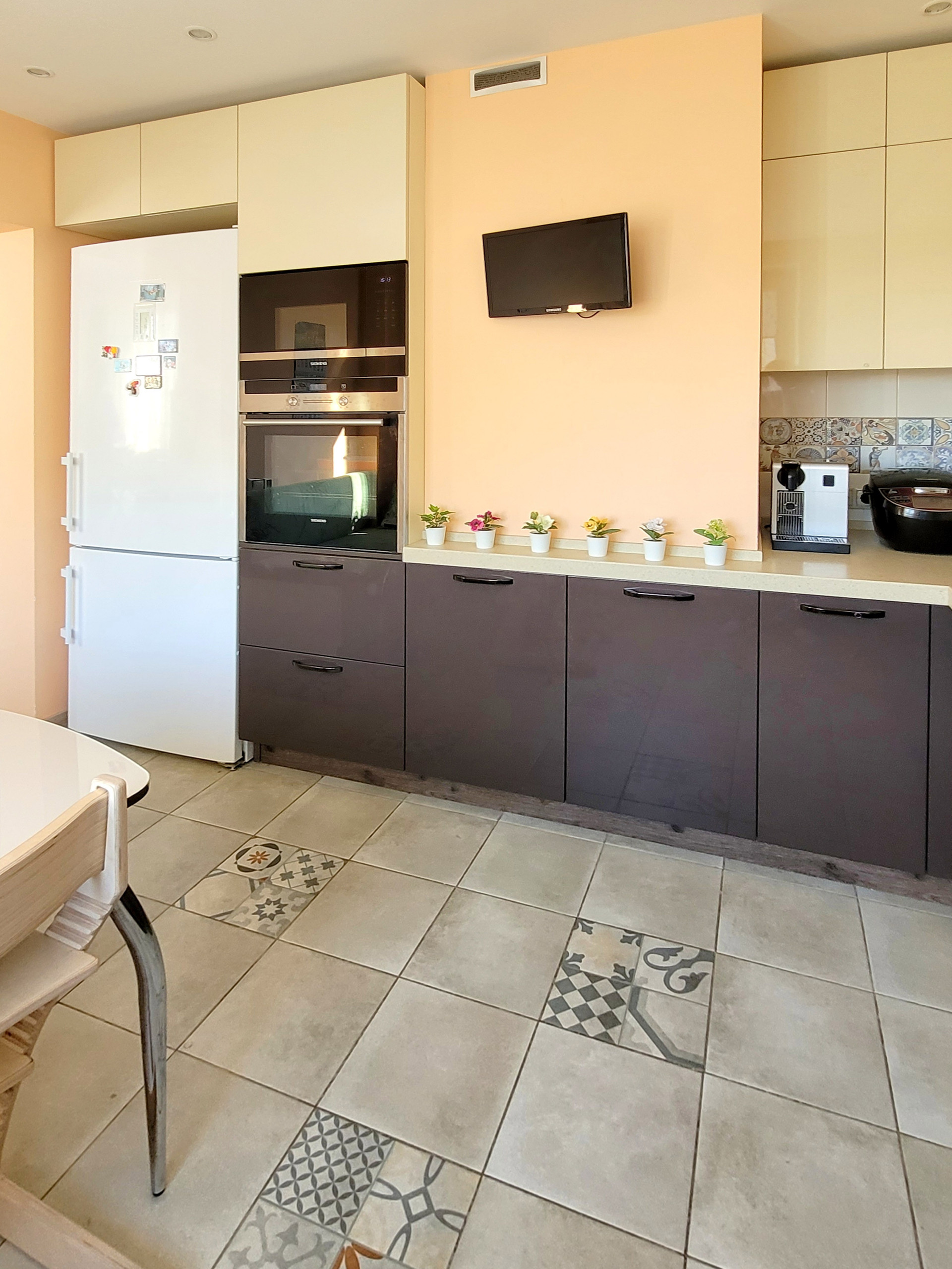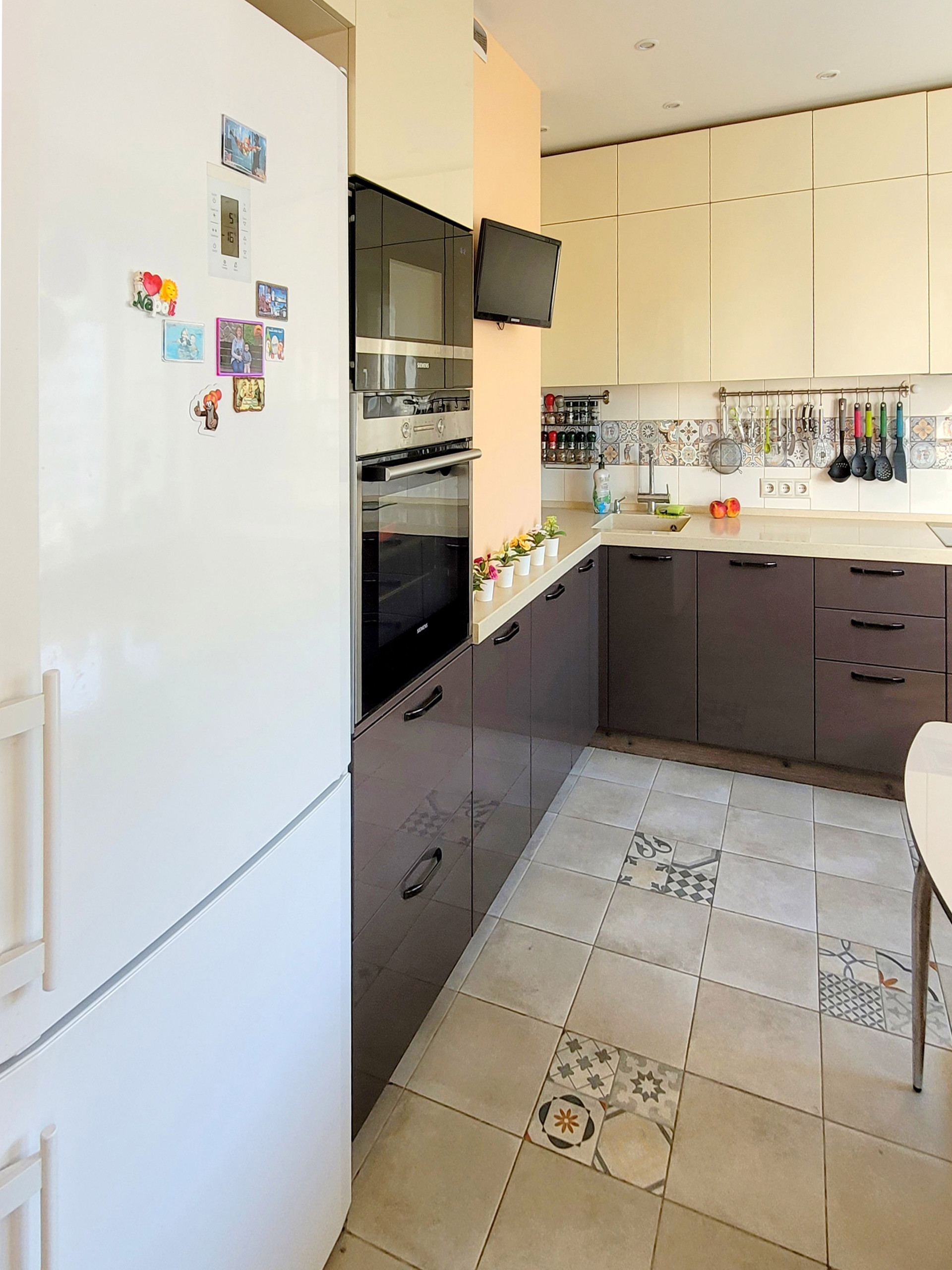Кухонная мебель (делалась под заказ, МДФ, глянец) остаётся, как и вся встроенная техника (Siemens); есть встроенная посудомоечная машина, индукционная панель, духовка, СВЧ-печь, вытяжка (выведена в вентиляцию), система фильтрации воды.