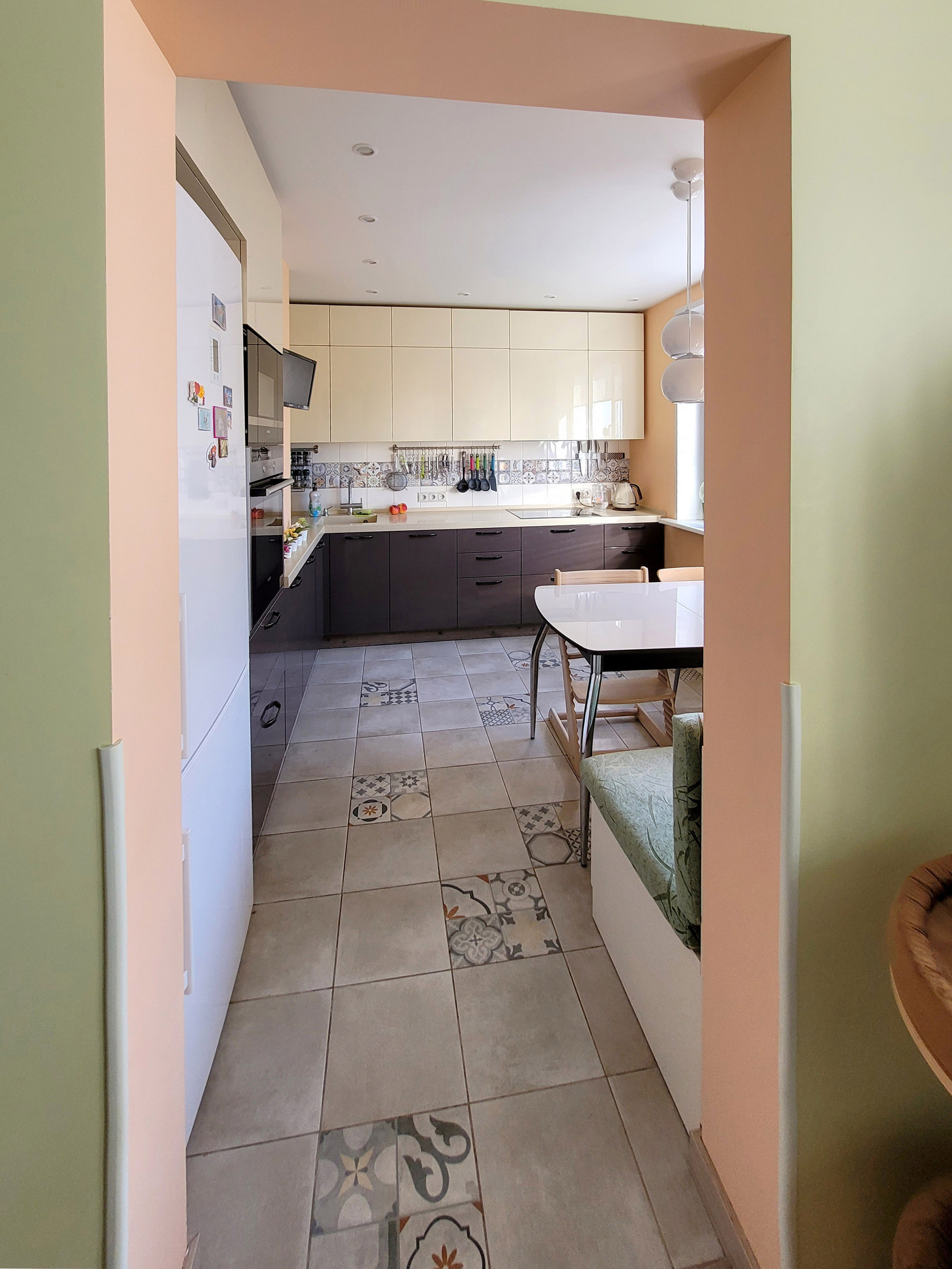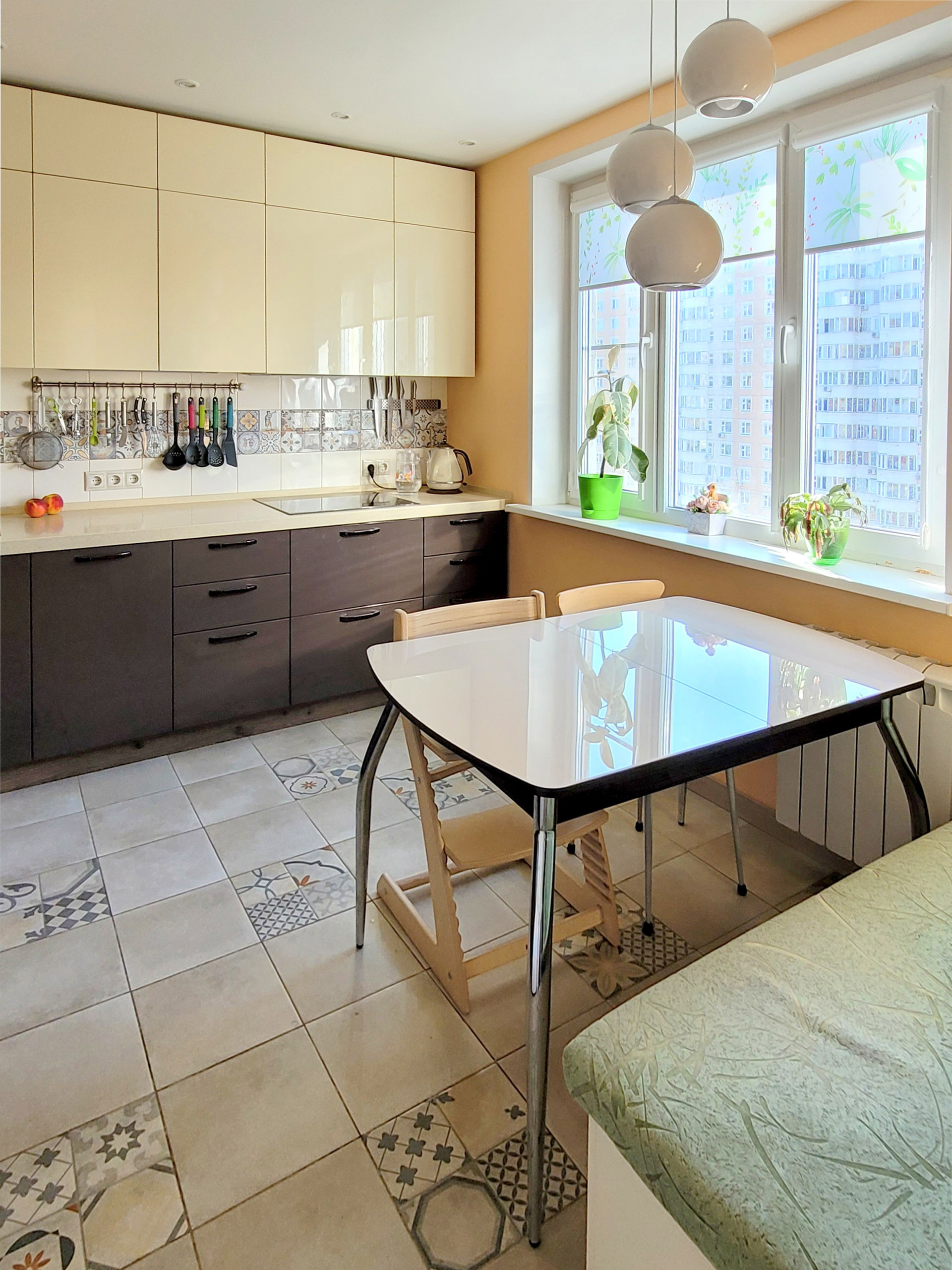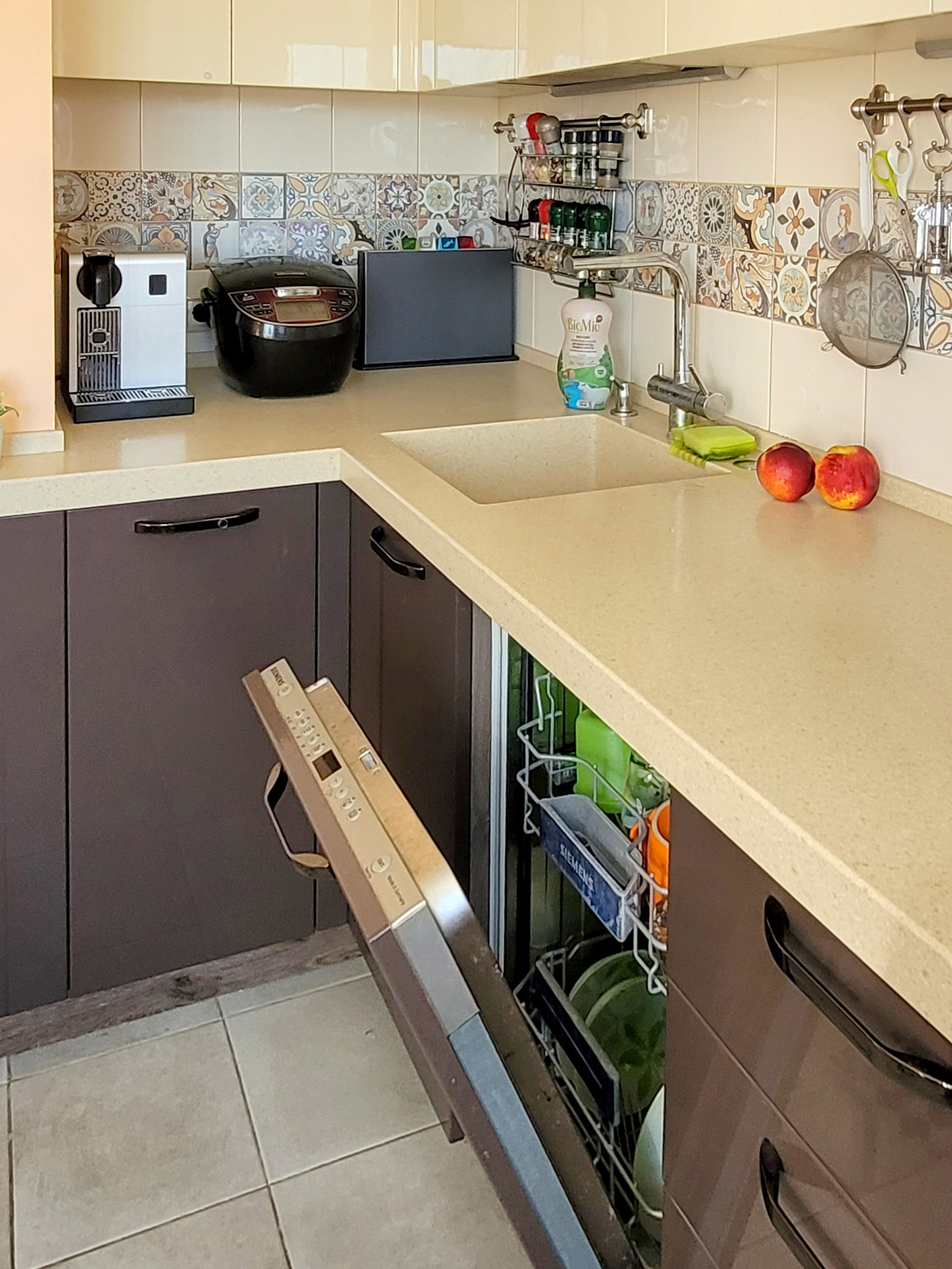 Кухонная мебель (делалась под заказ, МДФ, глянец) остаётся, как и вся встроенная техника (Siemens); есть встроенная посудомоечная машина, индукционная панель, духовка, СВЧ-печь, вытяжка (выведена в вентиляцию), система фильтрации воды.