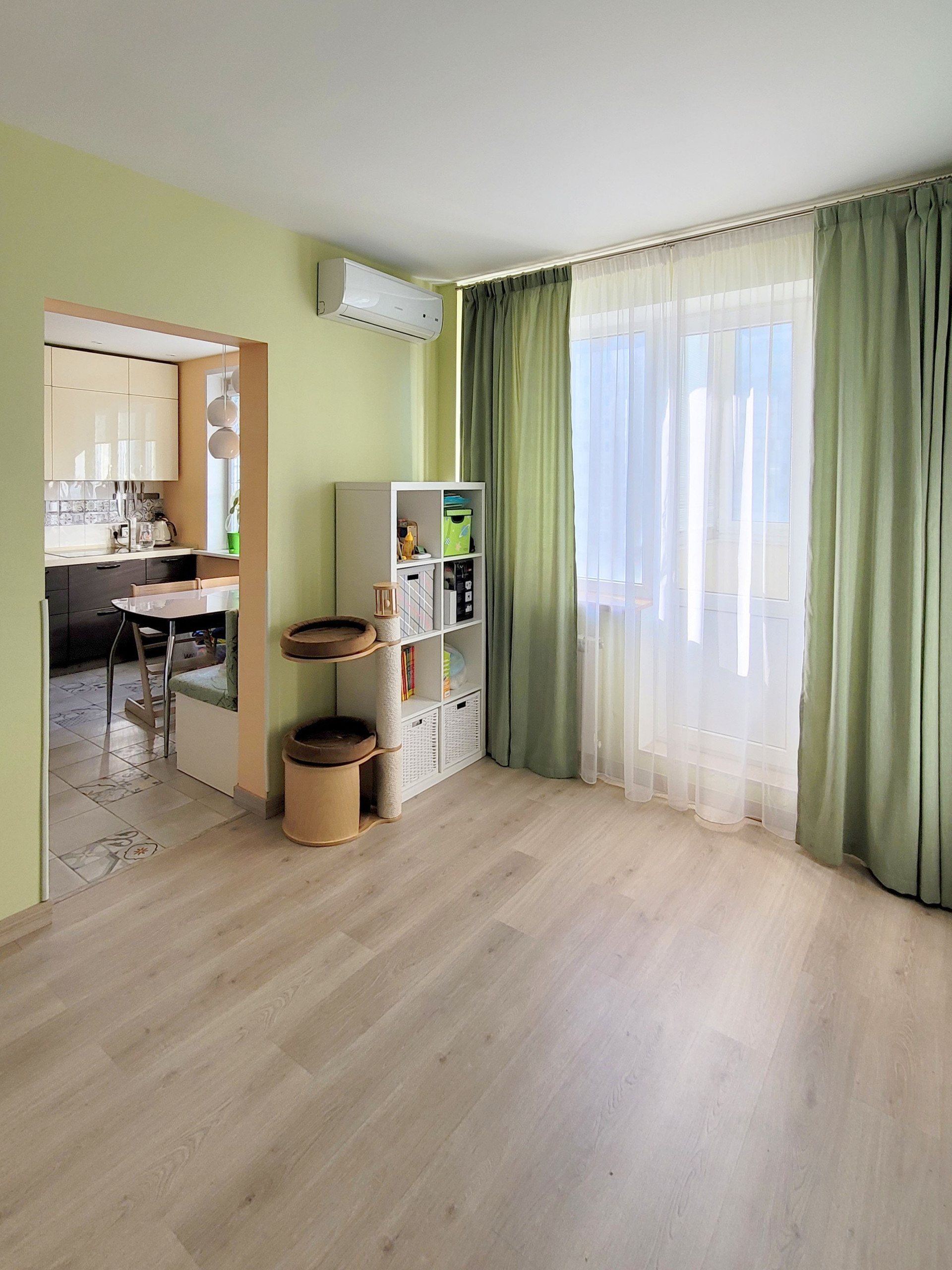Выполнена перепланировка (проход на кухню сделан через гостиную, и к одной из комнат присоединена лоджия). Перепланировка узаконена, все документы имеются (МНИИТЭП, МЖИ, БТИ, ЕГРН). За счёт перепланировки квартира кажется больше и уютнее.