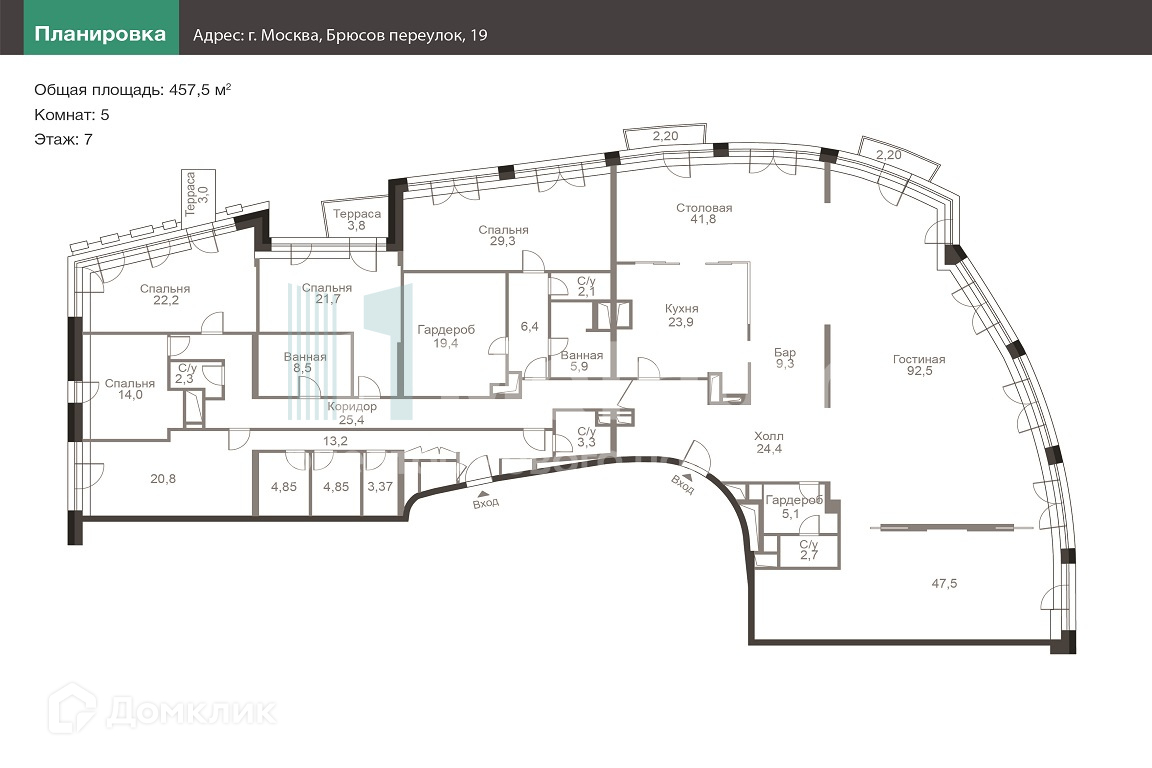 5-комнатная квартира, 457.5 м2, этаж 7 / 22, на продажу в Москве, Брюсов переулок, 19